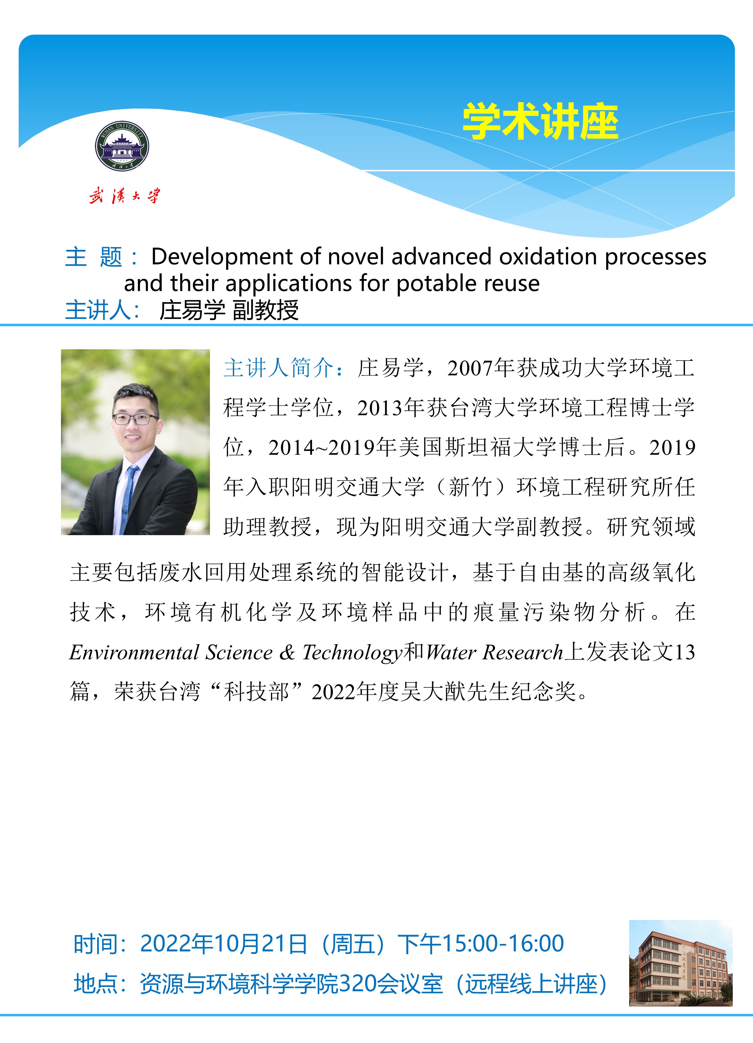 【学术讲座】Development of novel advanced oxidation processes and their applications for potable reuse