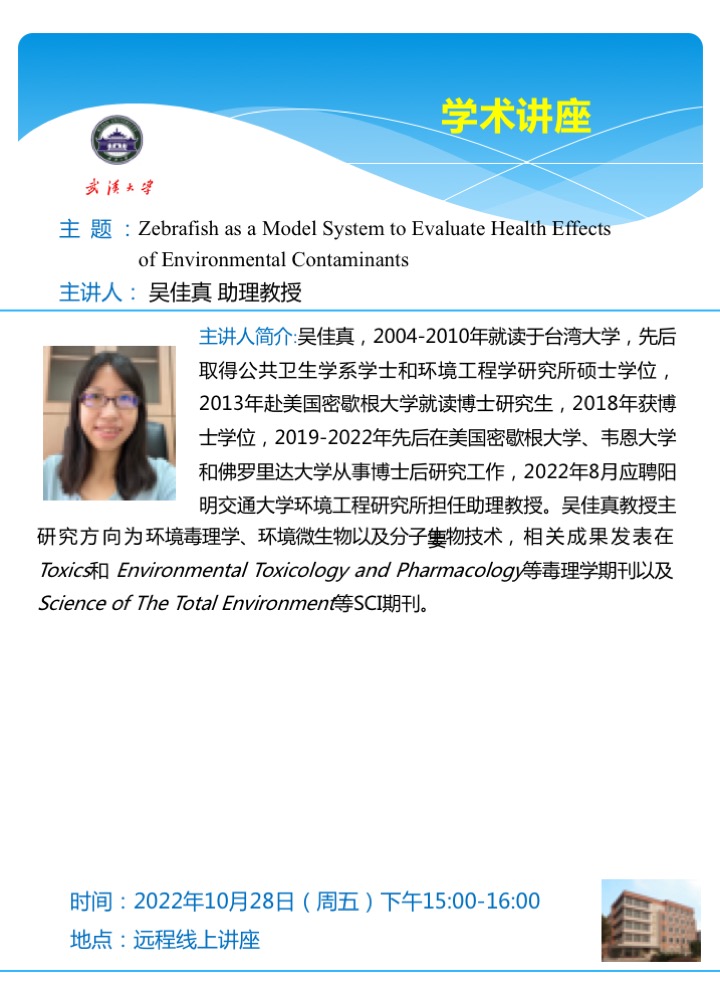 【学术讲座】Zebrafish as a Model System to Evaluate Health Effects of Environmental Contaminants