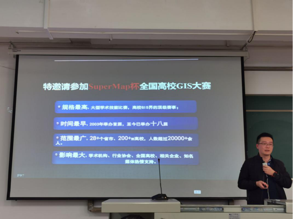马志超总监与同学们分享了GIS热点及应用。主要分为三个模块:地理信息产业现状、地理信息技术热点和超图GISer进阶之路。马老师围绕GIS的发展与热点作了一系列精彩的论述,分析了地理信息企业对人才的需求,并向高校GISer提出了几点建议。通过马志超总监的讲解,同学们对GIS专业和发展有了更加深刻的认识与理解。