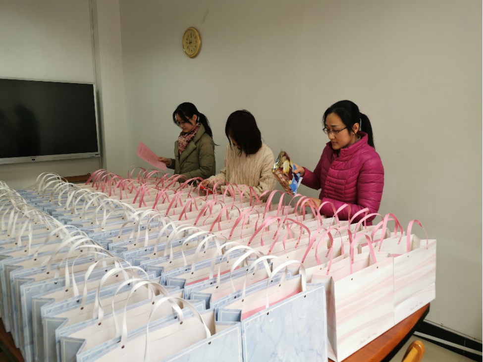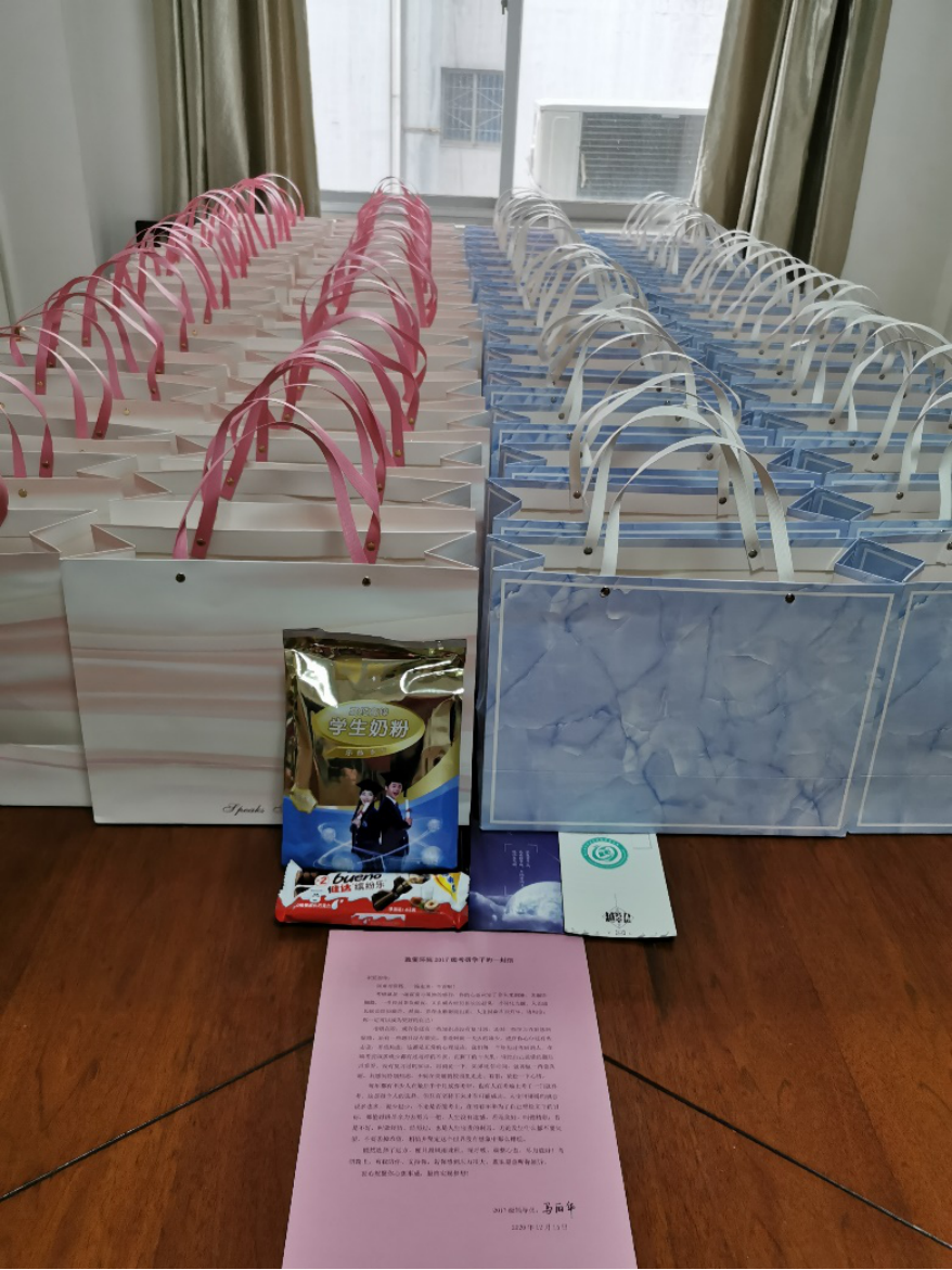 为本科2017级108位考研学子送上了考研“加油包”。在学院领导的大力支持下,2017级辅导员马丽华老师带领毕业生委员会的同学选购物资、搬运礼品、分装礼袋,为所有考研的同学精心准备好一份份“加油包”,由各班负责人将“加油包”分发到同学们手中。