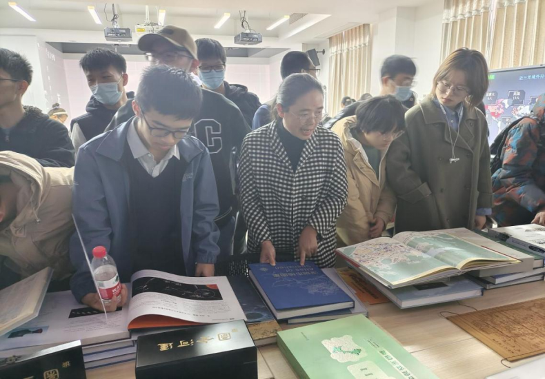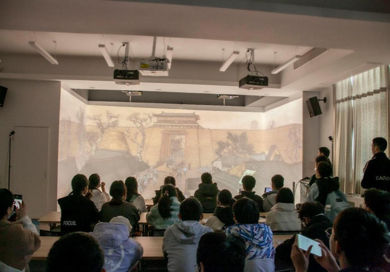 在518实验室门口绘制着一副巨大的立体地图,同学们先是驻足于实验室门口,地信系翁敏老师指着墙面上的立体地图,让同学们寻找自己家乡对应的位置,增加同学们对地理位置的空间认知。有序进入实验室后,同学们看到了琳琅满目的地图作品,翁老师绘声绘色地讲解一幅幅地图的由来,让同学们感受到地图制图学的魅力。紧接着李精忠老师展示了全息化的清明上河图,画上的人们栩栩如生,更是让同学们体会到了信息与图像的结合多么迷人。