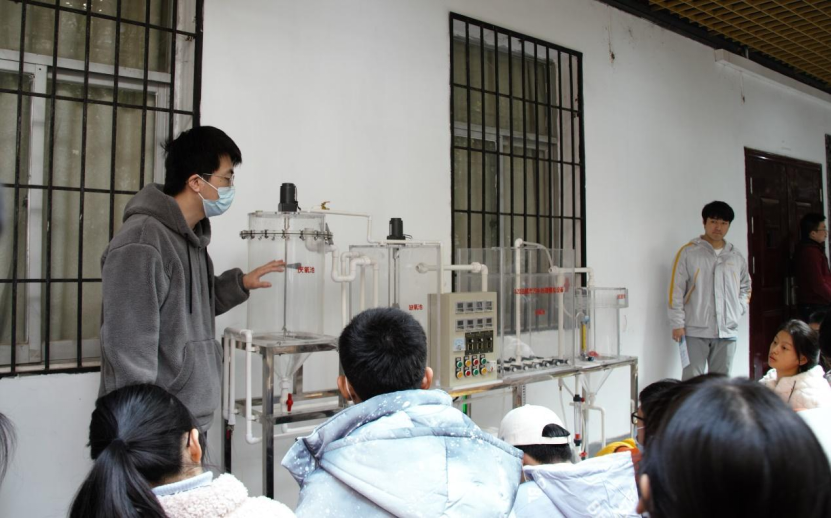 如何实现污水净化?对环境工程感兴趣的同学们在这个环节可是大饱眼福。王旭老师首先对身边的污水处理装置做了一个简单的介绍,接着指出水污染主要是由氮元素、磷元素和有机物导致的,引导大家从微生物的角度思考该污水处理器的原理。厌氧池、缺氧池、好氧池三个处理池相互配合,最后通过沉淀池就能得到处理后的水了。王老师还抛出了一些问题,引导大家思考几个处理池的区别,以及密闭或搅拌等处理方式各自的作用,让大家也化身小小科学家,体验了一把近距离接触实验设备的感觉。