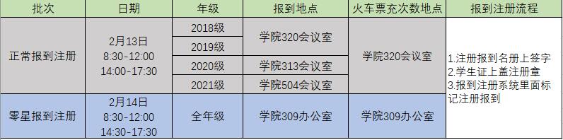 按照学校《关于2021-2022学年第二学期普通本科生报到注册》的通知要求(//uc.oldwanglt.com/info/1039/12866.htm),2022年2月13日(周日)全天为普通本科生报到注册时间。同时学校为方便2月13日晚到校同学报到,注册系统开放时间为2月13-14日两天。根据疫情防控要求,本次采用年级分开报到的原则,现将报到注册工作安排如下,请同学们携带校园卡和学生证到自己年级所对应会议室办理报到注册手续。