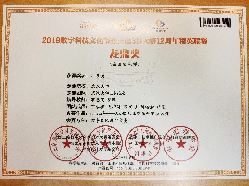 蔡忠亮、费腾老师指导的学生团队作品“ici此地——AR娱乐社交场景解决方案”最终以特等奖晋级全国总决赛,在本次比赛中荣获全国一等奖。