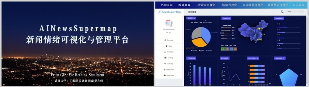 本科生丁家祺、岳远紊、胡森、楚尔轩组成,蔡忠亮、费腾老师担任指导老师。作品结合AI自然语言处理与GIS技术,致力于实现新闻文本情绪信息的可视化与管理,从而助力舆情监测与社会感知,为决策者提供来自地理视角的洞见。