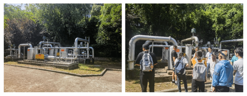 在工作人员的介绍下,同学们了解到,三标的规范封场工程包括:①填埋气体导排井与收集输送管道工程;②填埋气体集中处理工程;③渗滤液污水导排与收集输送管道工程;④渗滤液污水集中处理工程;⑤填埋气体与渗滤液导排收集与处理工艺设备系统等。工程首先在垃圾表层铺设了防渗膜,防止渗滤液和沼气等污染物外泄,再集中处理废液和废气。垃圾产生的渗滤液是一种污染性很强的特殊污水,工程采用先进的DTRO技术处理达标排放,并用于绿化浇灌,从而实现内部循环和无害化处理的效果。而垃圾填埋场产生的气体(LFG是以甲烷为主的混合性污染气体,对大气环境污染性强尤其对温室效应贡献率高。因此,工程采用专用的氧化焚烧技术,其通过焚烧过程将气体转化为二氧化碳,从而消除污染。
