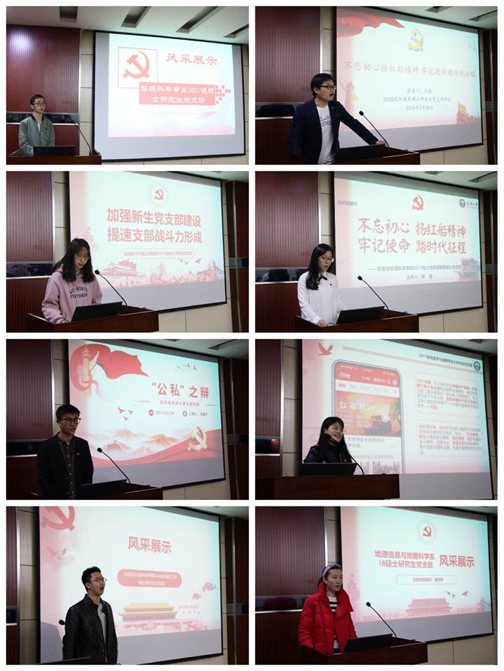 本次研究生党支部风采大赛包括初评和现场展示两个环节。经过对各党支部提交的工作案例材料进行初步评选,共有八个党支部进入现场展示环节。在现场展示的过程中,每个党支部都在短短的时间内对本支部的特色活动和成员风采进行了充分展示。土地资源管理专业2017级硕士研究生党支部展示了歌曲《我们都是追梦人》的手势舞,地图制图学与地理信息工程专业2017级硕士研究生联合党支部结合学习强国APP进行了历史重演……各党支部的风采展示形式多样,各具特色。同时各支部还在学习贯彻习近平新时代中国特色社会主义思想和党的十九大精神,学习领会习近平总书记关于加强党的政治建设、教育工作等重要论述下的背景下,对 “不忘初心扬红船精神,牢记使命踏时代征程”的主题进行了微党课展示,充分体现了老王论坛