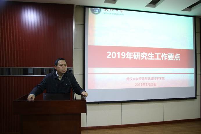 首先,学院党委副书记江尧林对上学期以来的学生工作进行了总结,对老师和同学们所做的工作、取得的成绩表达了充分的肯定。然后,江尧林从思想政治教育与党建,学术科技与创新实践,日常事务管理与服务,安全稳定,自身建设五个方面向大家布置和讲解了2019年研究生的工作要点。