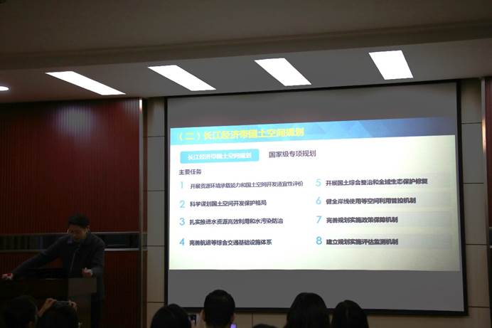 最后,杨昔对国土空间规划的主要内容进行了分析。他指出,国土空间规划的主要任务是“定战略、定目标、定结构、定边界和定政策”。此外,他结合武汉市国土空间规划进行深入分析,告诉同学们国土空间规划不仅仅是物质空间的技术规划,还需要有国土空间规划的大视野,在内容上应把握好战略定位与总体目标,坚持全域视野、系统思维、着眼于资源利用、要素配置、安全生产的角度统筹各类空间行为,并对生态、城乡、产业、设施、文化等格局作出统筹安排。