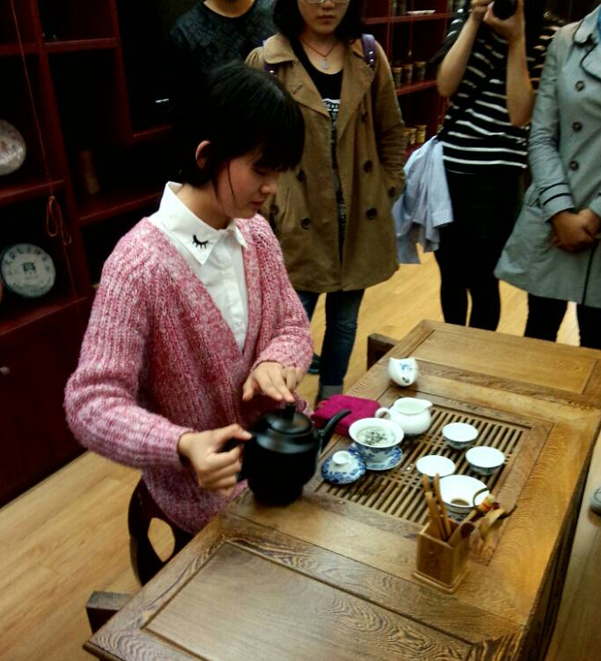 研究生们观看湖北经济学院学生代表的茶艺表演