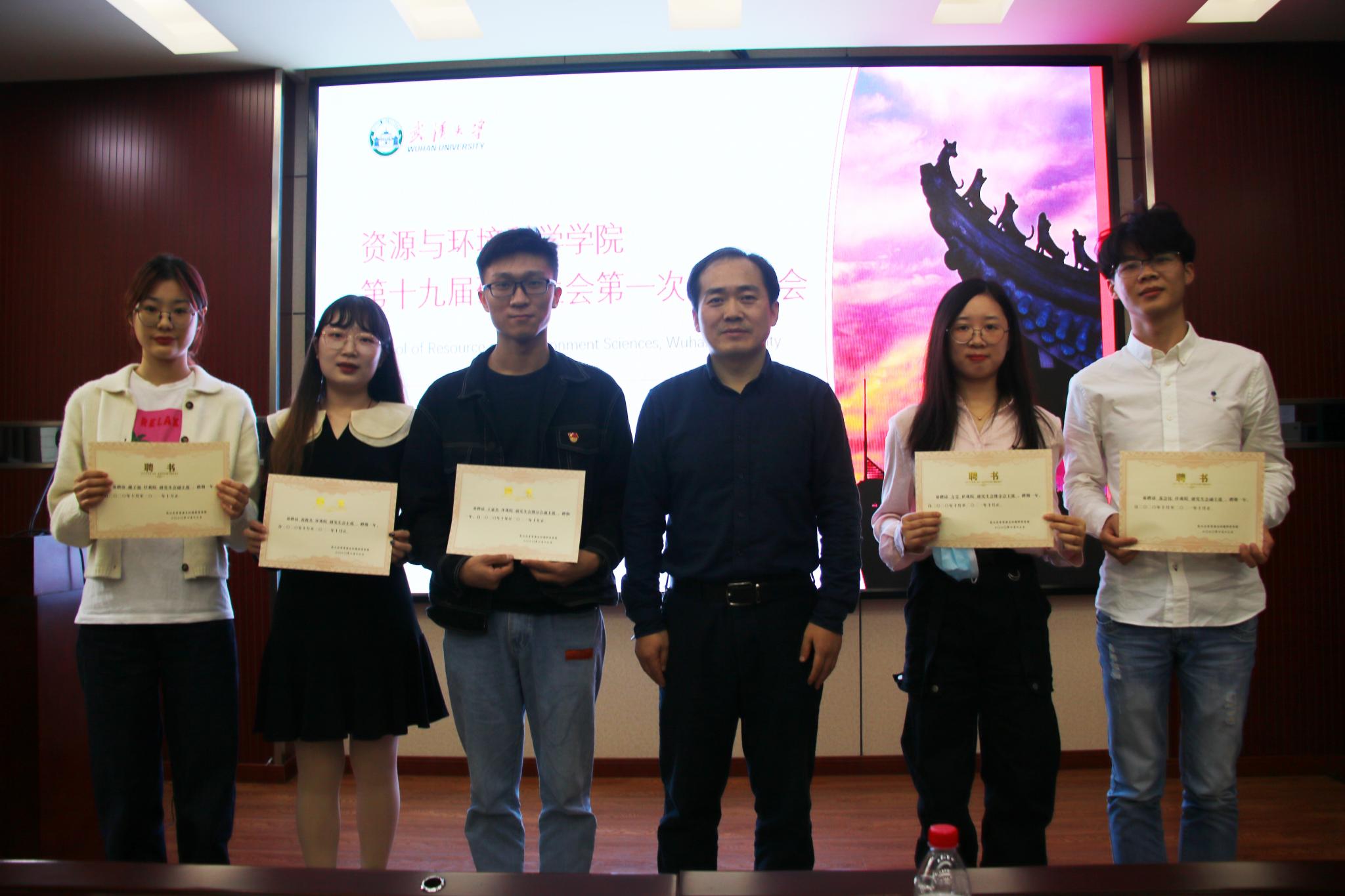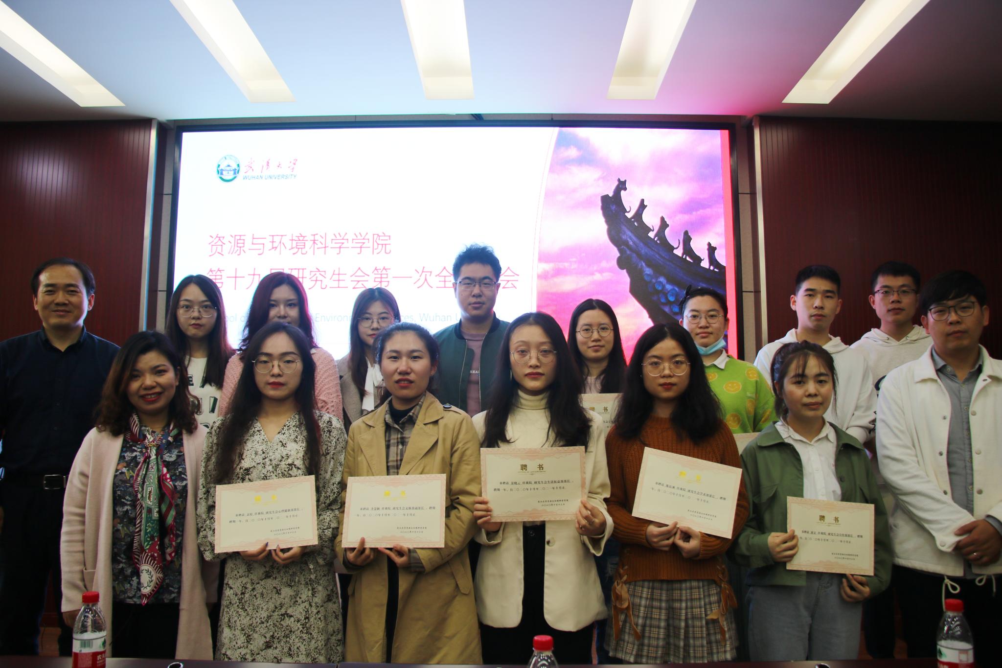 会议第二项:由院党委副书记雷起宏老师、院研究生辅导员梅菲老师、院研究生辅导员李韩老师为第十九届研究生会主席团、部长团成员颁发聘书。