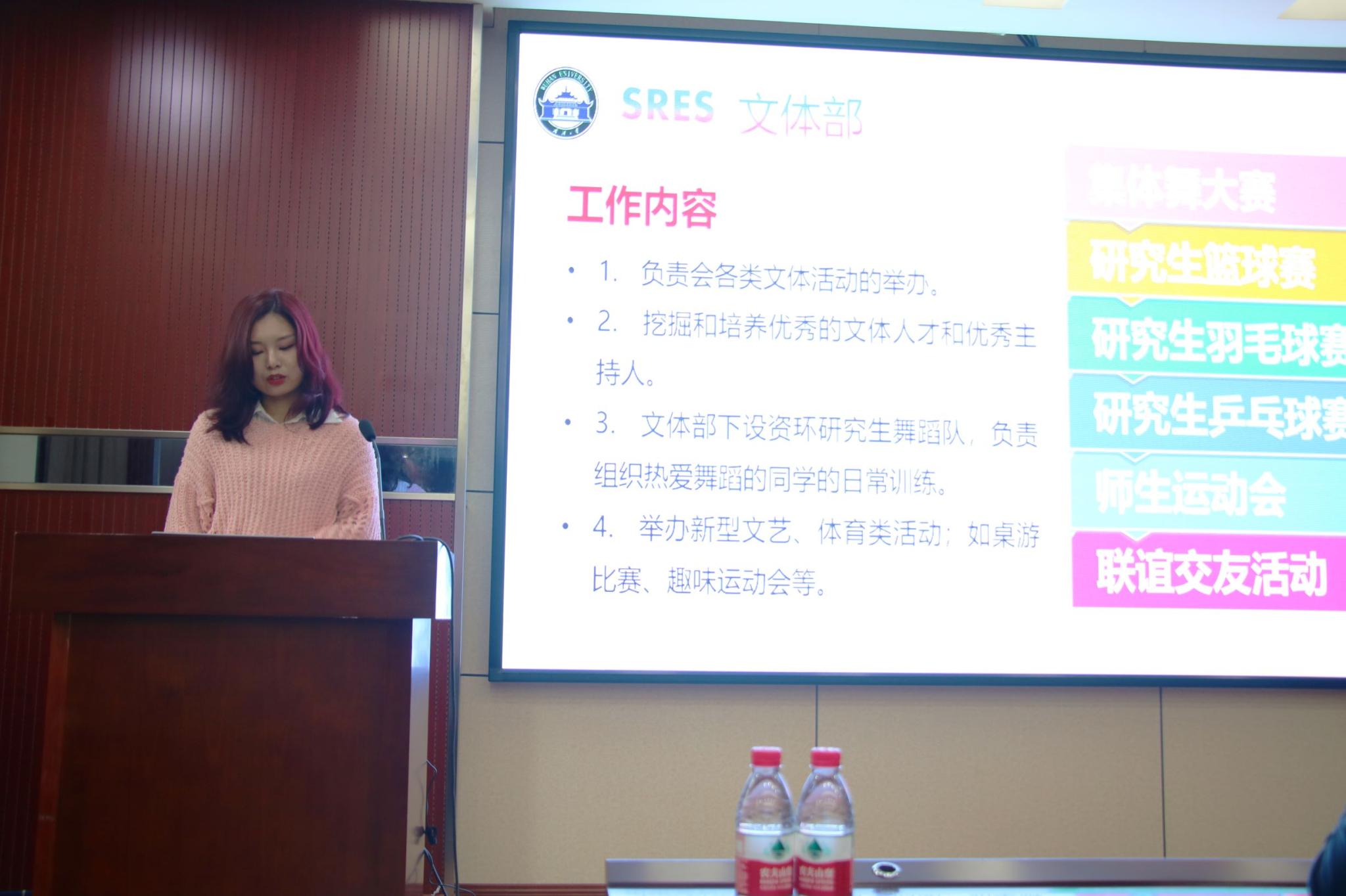 会议第五项:研究生会副主席苏会钰发言。表示资环研会是一个结交新朋友、锻炼新本领、开阔新视野、调节科研学习和生活的优秀集体,希望大家都能传承前辈精神,增强责任感和使命感,用知识充实大脑、用实践铸造成长、用激情燃烧梦想,不负青春盛景。