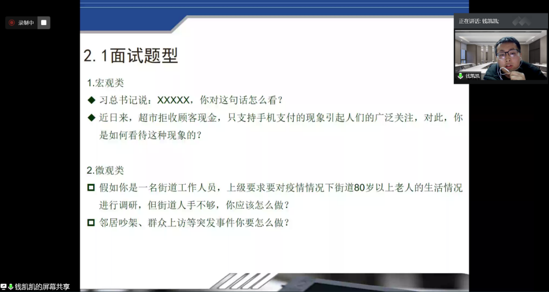 钱凯凯主要从上海选调笔试题型、面试、考察准备、工作感受和考试建议几个方面进行了分享。在笔试行测和申论部分,钱凯凯建议大家要提升熟练水平和速度,特别是申论,要多进行考前模拟,掌握小作文答题套路、大作文文章布局,更要注重字迹清晰。在面试和访谈部分,钱凯凯分享了结构化面试的基本流程并强调在结构化面试时,评述他人要语言略委婉,攻击性不能太强,回应他人评述要保持谦虚平和的心态,不能面红耳赤甚至生气。对于面试后的访谈,钱凯凯提醒正式访谈时可能会出现临时更换主题的情况,考生需要提前做好心理准备,同时建议选座位时顺序不要太靠前,顺序靠后可以保证自己有更充足的时间思考,同时还听取并结合前人的见解来回答问题。