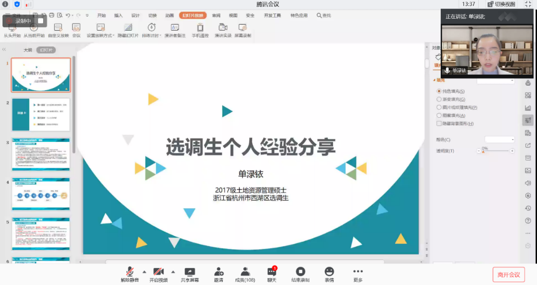 单渌铱从浙江省选调生报考条件、流程、笔试、面试、个人工作内容、选调生备考建议几个方面进行了分享。首先,单渌铱着重介绍了确定人选、任职定级、培养锻炼相关政策:浙江省面试结束后,按照“首轮排名,二轮双选”的方式确定拟选调人选;任职定级上选调生录用后实行为期一年的试用期;选调生接受专门培训后,安排到基层锻炼。关于笔试,单渌铱介绍了2020年浙江省选调生笔试和面试的题型。最后,单渌铱强调笔试一定要多刷题,面试可根据自己情况酌情报班并且加强练习,同时要注意多关心时事政治,品读习近平语录,提升思想觉悟,答题时与时事联系在一起。