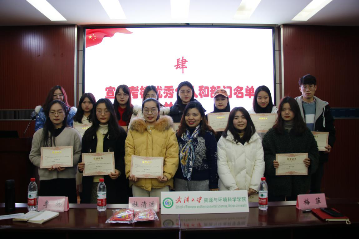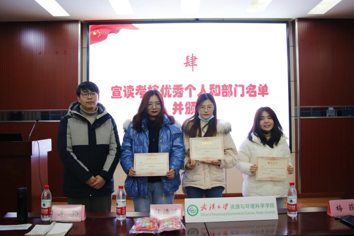 大会第三项,研究生会主席张俊杰宣读了学院第十九届研究生会中期考核结果。梅菲老师和李韩老师依次为陈佑淋等14名考核优秀的同学,宣传部等3个考核优秀的部门颁奖,并进行合影留念。