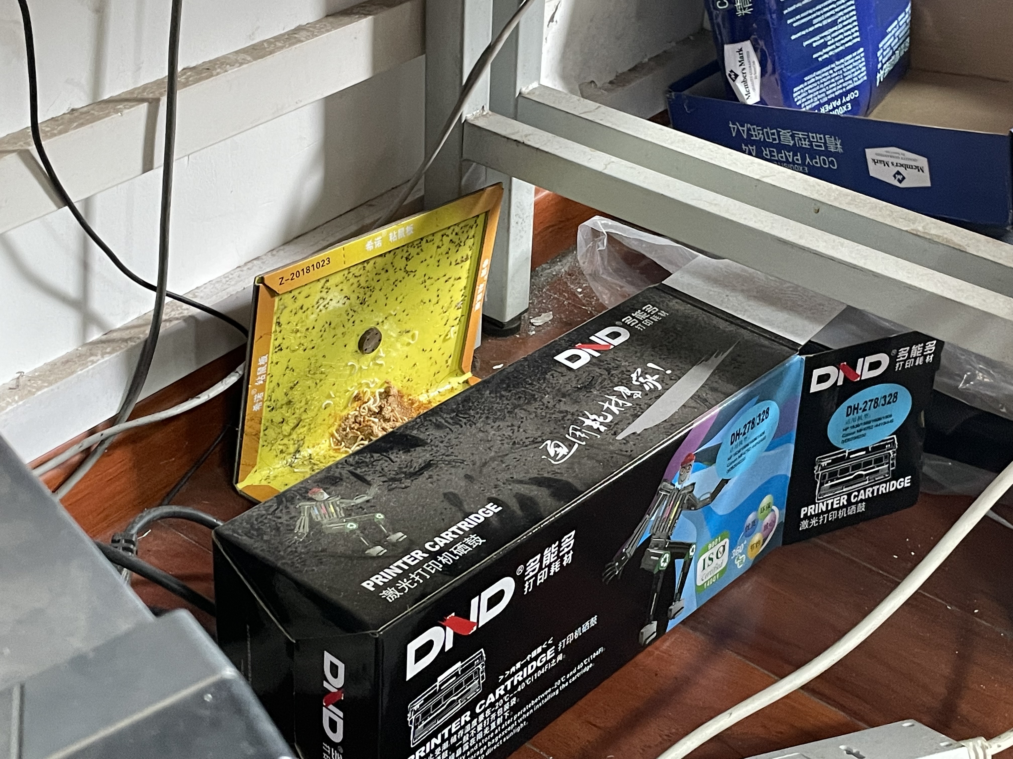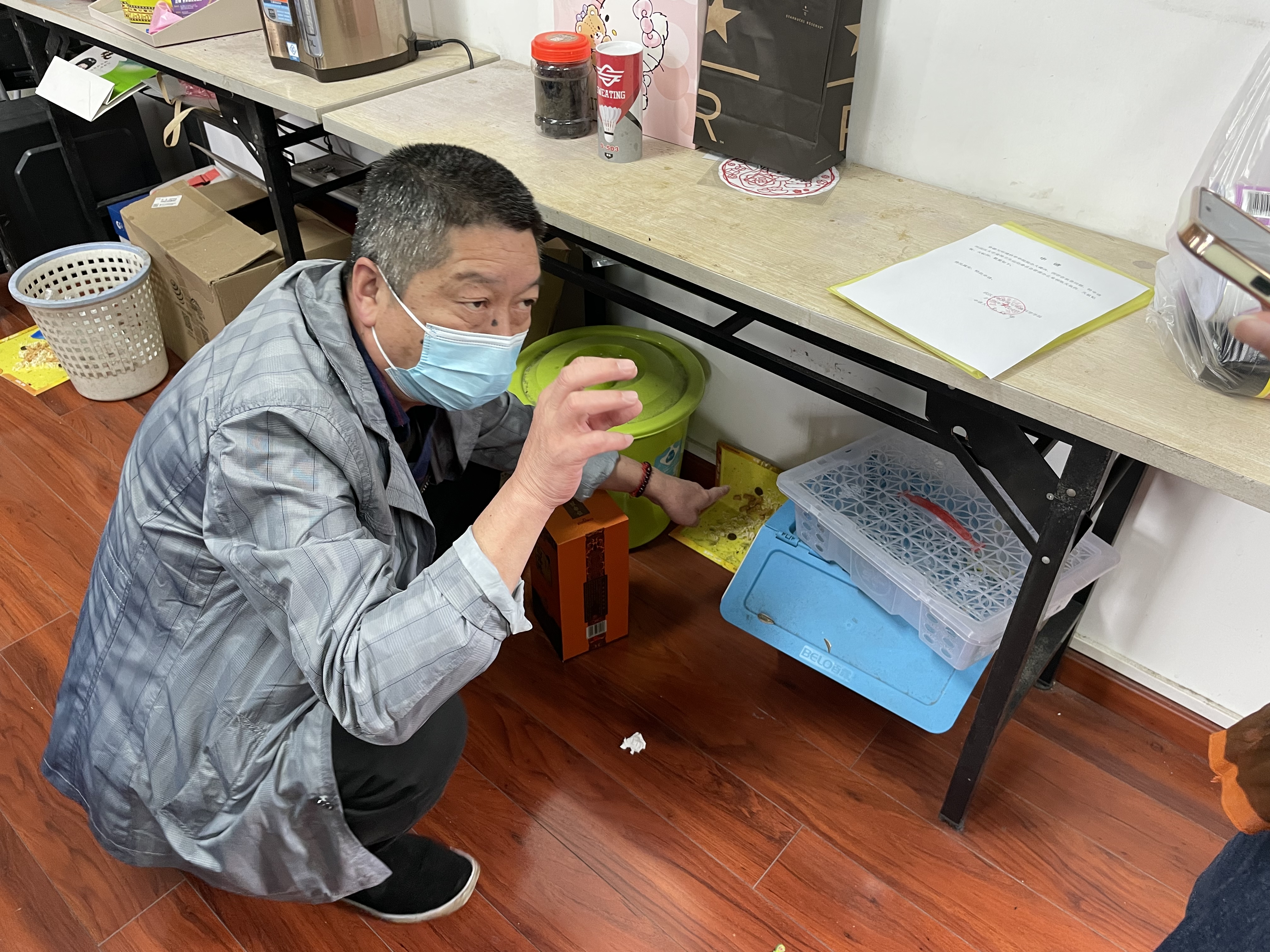 随后,我们将爱卫办老师们带来的粘鼠板和驱虫喷雾,分发给学院大楼内出现鼠患的其他6间研究生机房的同学们,并指导他们如何摆放粘鼠板。