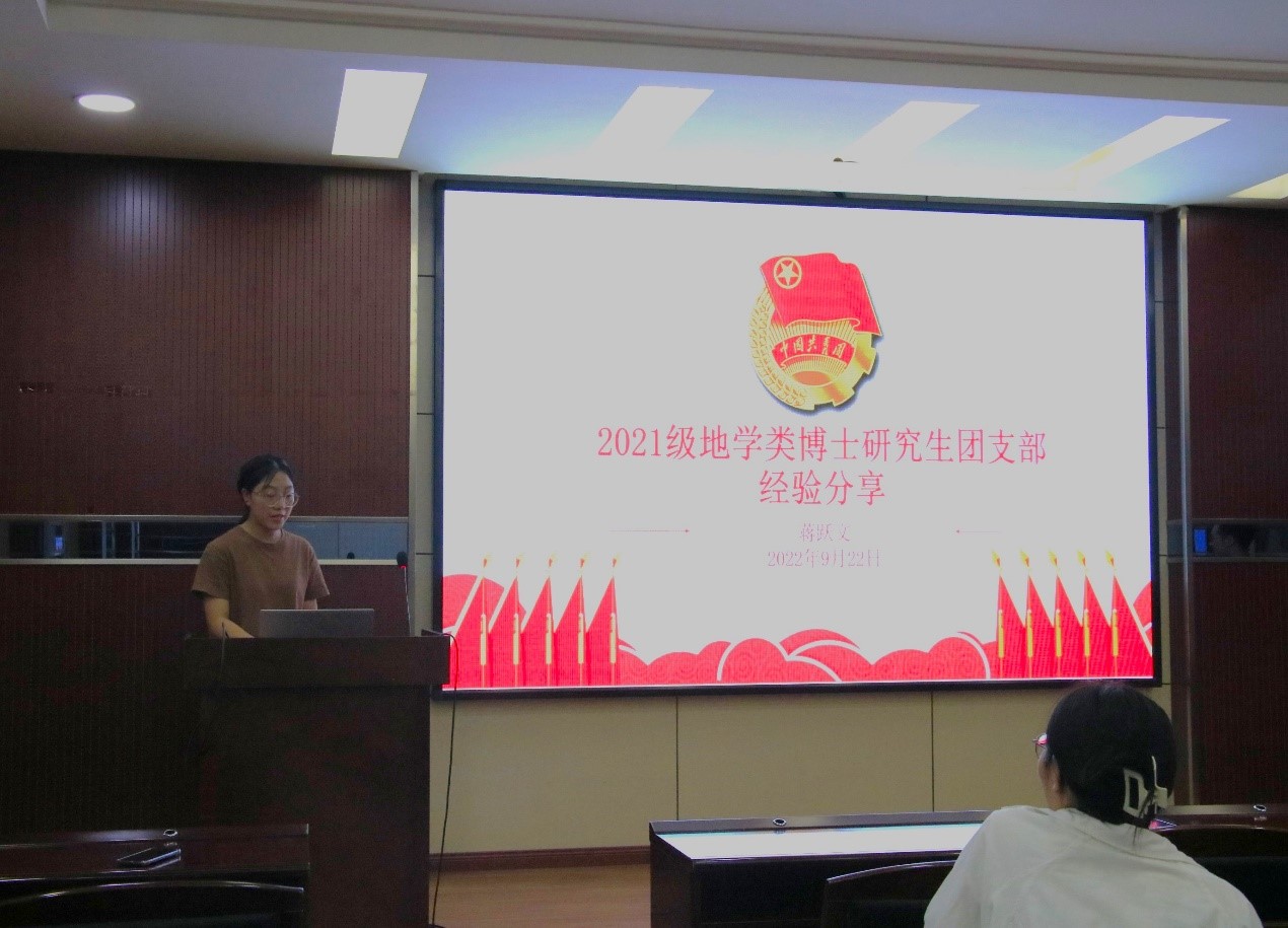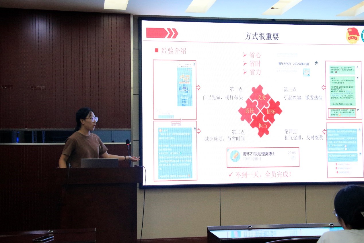 会议第三项,2021级地学类博士研究生团支部书记蒋跃文同学就如何调动支部团员青年大学习积极性作经验分享。蒋跃文同学提出核对团支部成员信息是首要任务,一定要逐一核对、确保每个同学填对个人信息,以此确保后台能够准确记录同学们的学习信息。蒋跃文同学进一步强调了督促方式的重要性,并根据自身经验提出了一些建议。