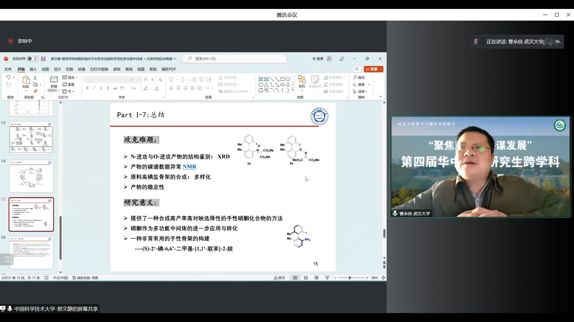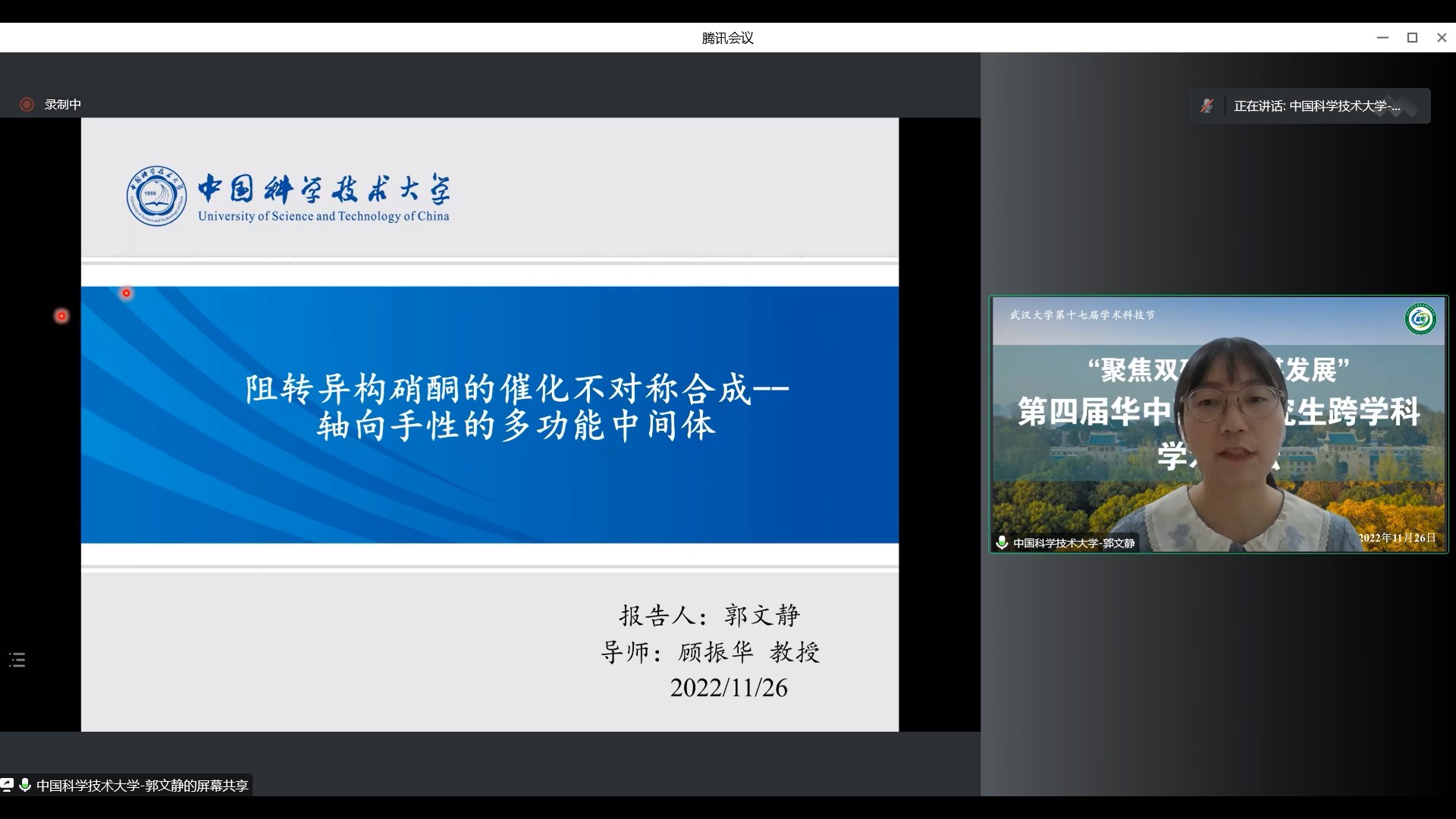 化学与分子科学学院曹余良教授作为点评老师。会议伊始,来自中国科学技术大学化学与材料科学学院的杨飞燕同学带来题目为“镍催化非活化烯烃的分子内不对称还原Heck反应”的报告。杨同学使用镍催化实现非活化1,1-二取代烯烃的分子内的不对称还原 Heck 反应,合成了一系列含有季碳手性中心的环状化合物,并在此反应中取得了优异的不对称诱导效果。曹老师肯定了杨同学的研究方向与工作内容,并建议杨同学今后汇报中应更加突出研究的重点、创新性与目的性。