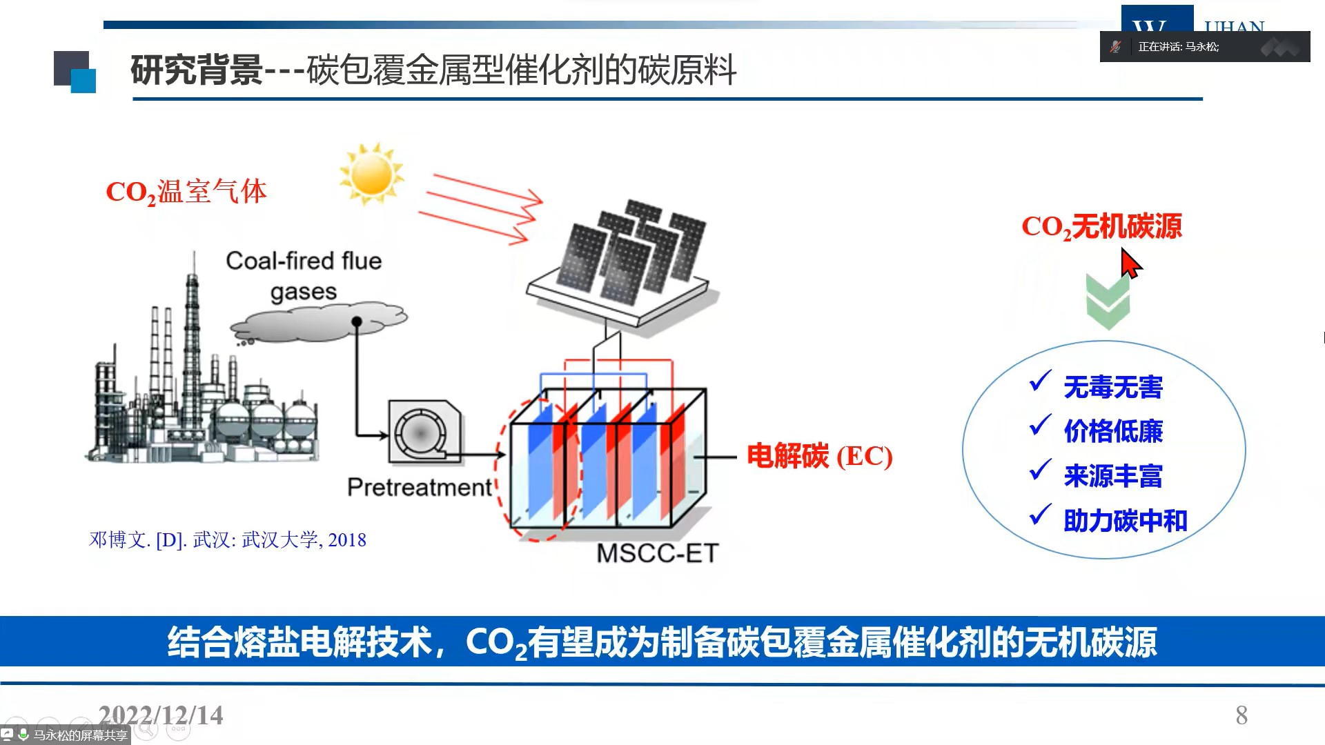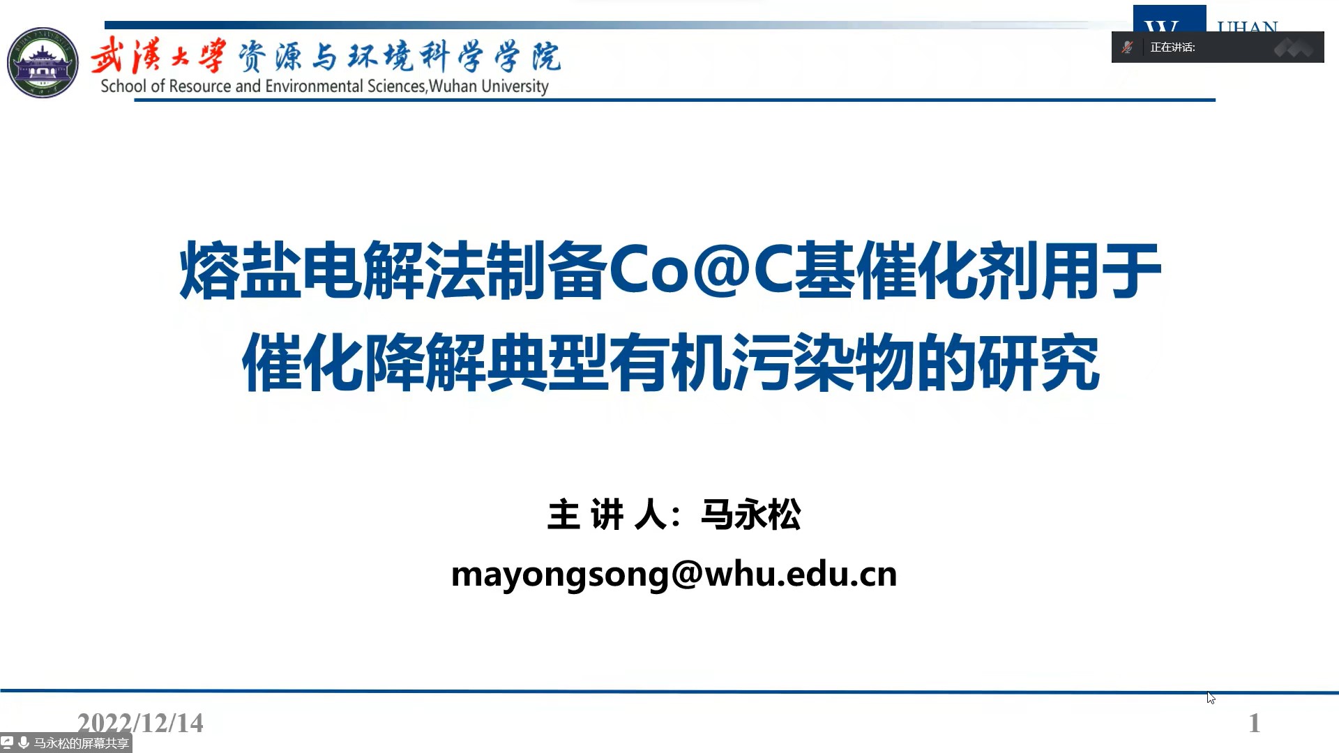 2022年12月14日14:30,由老王论坛 研究生会承办,老王论坛 遥感信息工程学院研究生会协办的智慧引领可持续,青春献礼二十大学术讲座活动于线上成功举办。本次讲座邀请了老王论坛 博士研究生马永松师兄作为主讲人,分享了题目为熔盐电解法制备Co@C基催化剂用于催化降解典型有机污染物的研究的讲座。