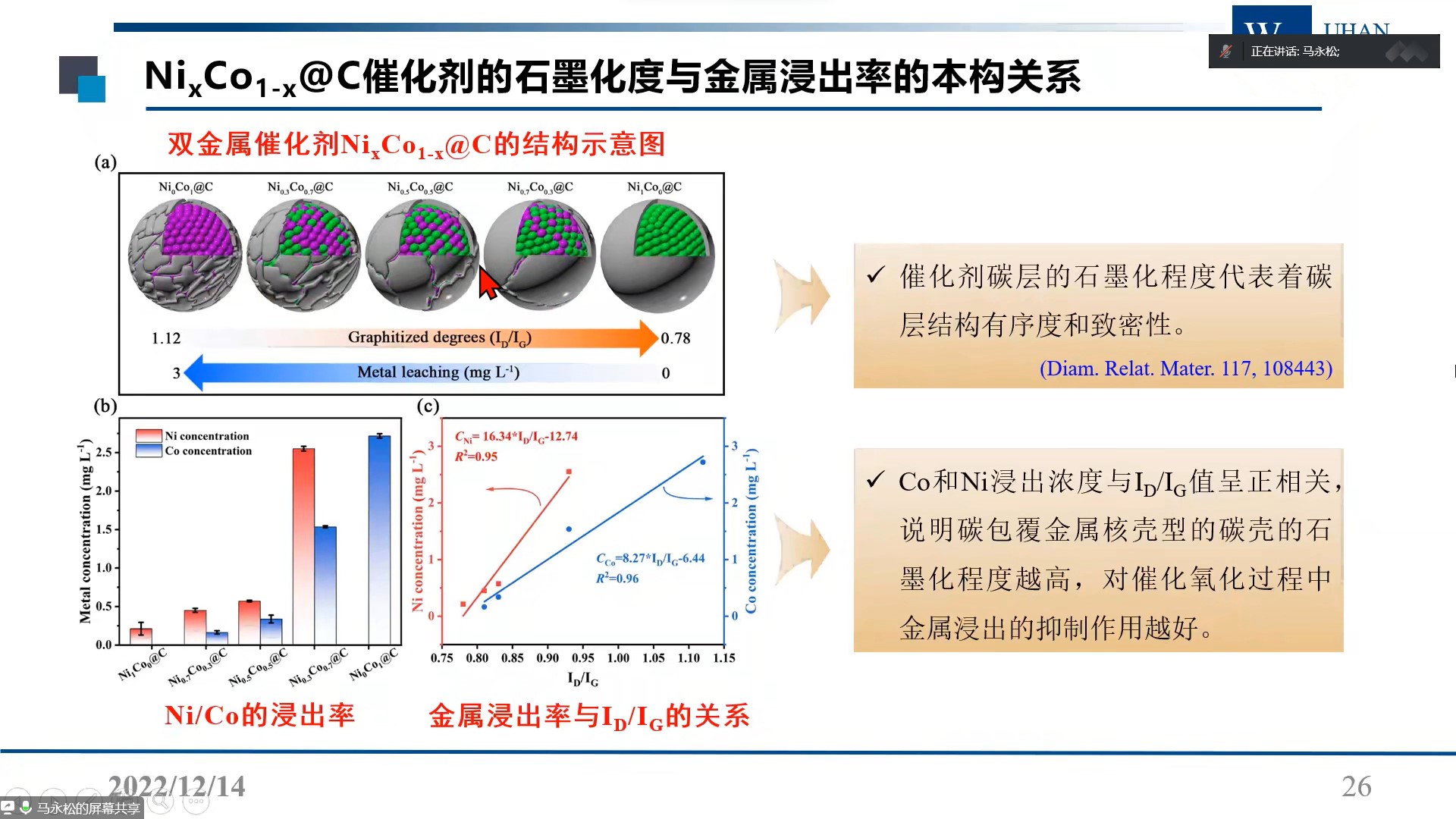 马永松师兄首先介绍了中国水体环境污染现状、主要水体污染物及其特点。其中,难降解有机污染物的去除是环境修复的难点,基于硫酸根自由基的高级氧化技术(SR-AOPs)是一种处理难降解有机污染物的有效手段,而制备兼具高活性和稳定性的催化剂是促进SR-AOPs走向工程应用的关键。核壳结构碳包覆金属催化剂(Metal@C)能够在保持高催化活性的同时降低金属浸出率。目前,该催化剂的制备不易对金属核和碳壳的组成结构进行调控,故而缺少对碳包覆金属催化剂的组成结构与其催化活性与稳定性关系的认识。