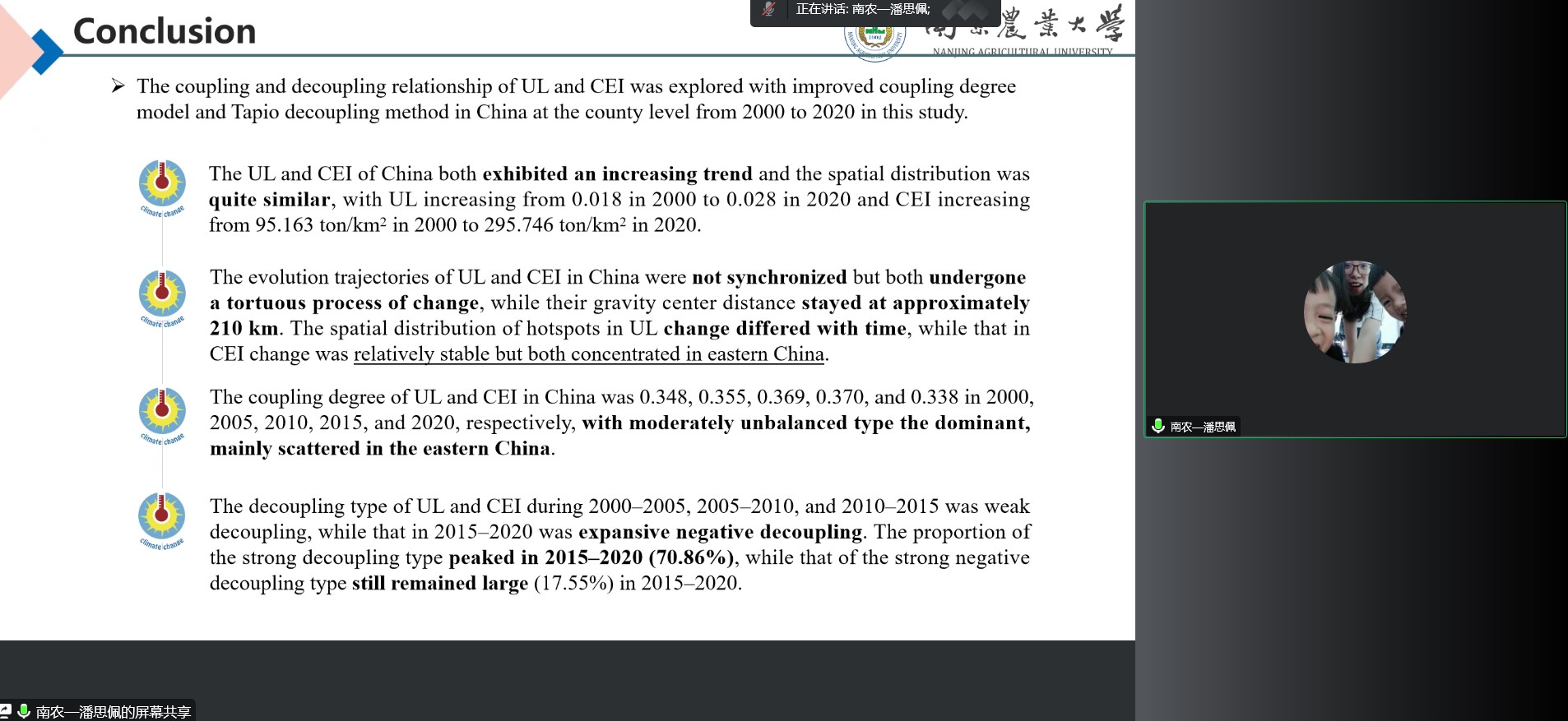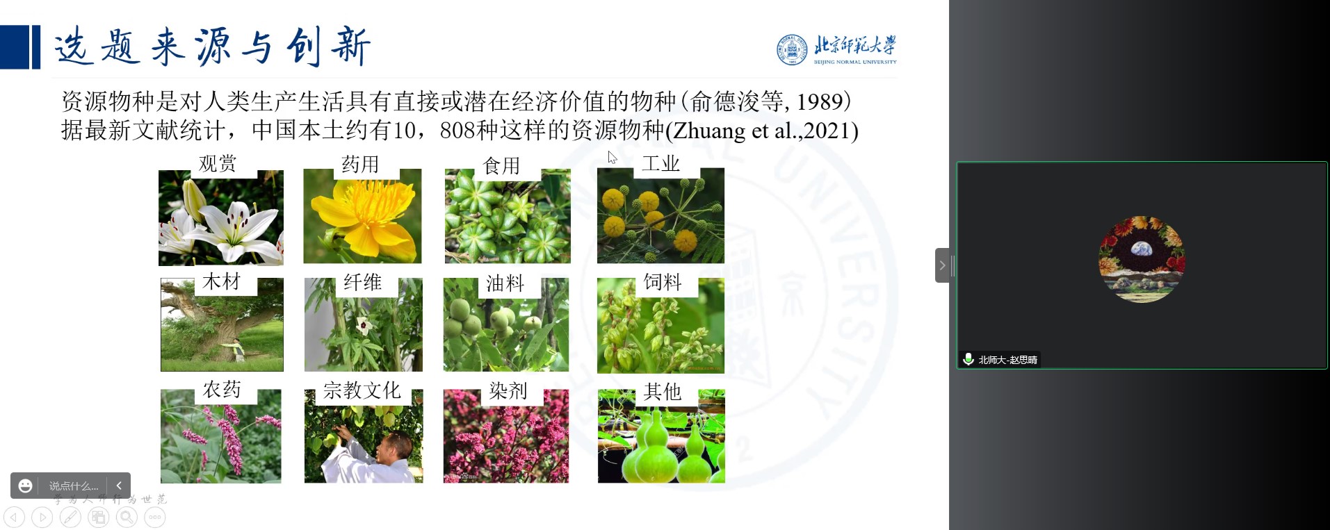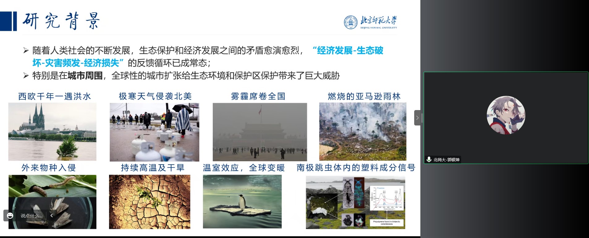 第一位带来分享的是来自南京农业大学公共管理学院的潘思佩同学,探讨了中国的城市化水平和碳排放的关系,为低碳城市和双碳目标提出了相关建议;来自北京师范大学地理科学学部的张棋同学对中国自然状态气象干旱到水文干旱传递的时空特征进行了分析,提出可以通过一些指标将该传递特征进行量化,以便更准确地进行预警;来自北京师范大学地理科学学部的郭银坤同学围绕如何有效整合多源生态环境数据问题展开,提出了生态环境质量评估新指标,探究了中国京津冀、长三角和粤港澳三大城市群20年的生态环境质量变化;来自北京师范大学地理科学学部的赵思晴同学围绕中国本土维管植物的多样性保护展开,分析了具有代表性的维管植物的空间分布规律、植物多样性热点和热点受保护现状,初步探讨了如何在未保护区开展特有种的保护工作,为我国生态文明保护与可持续发展提供了相关建议。