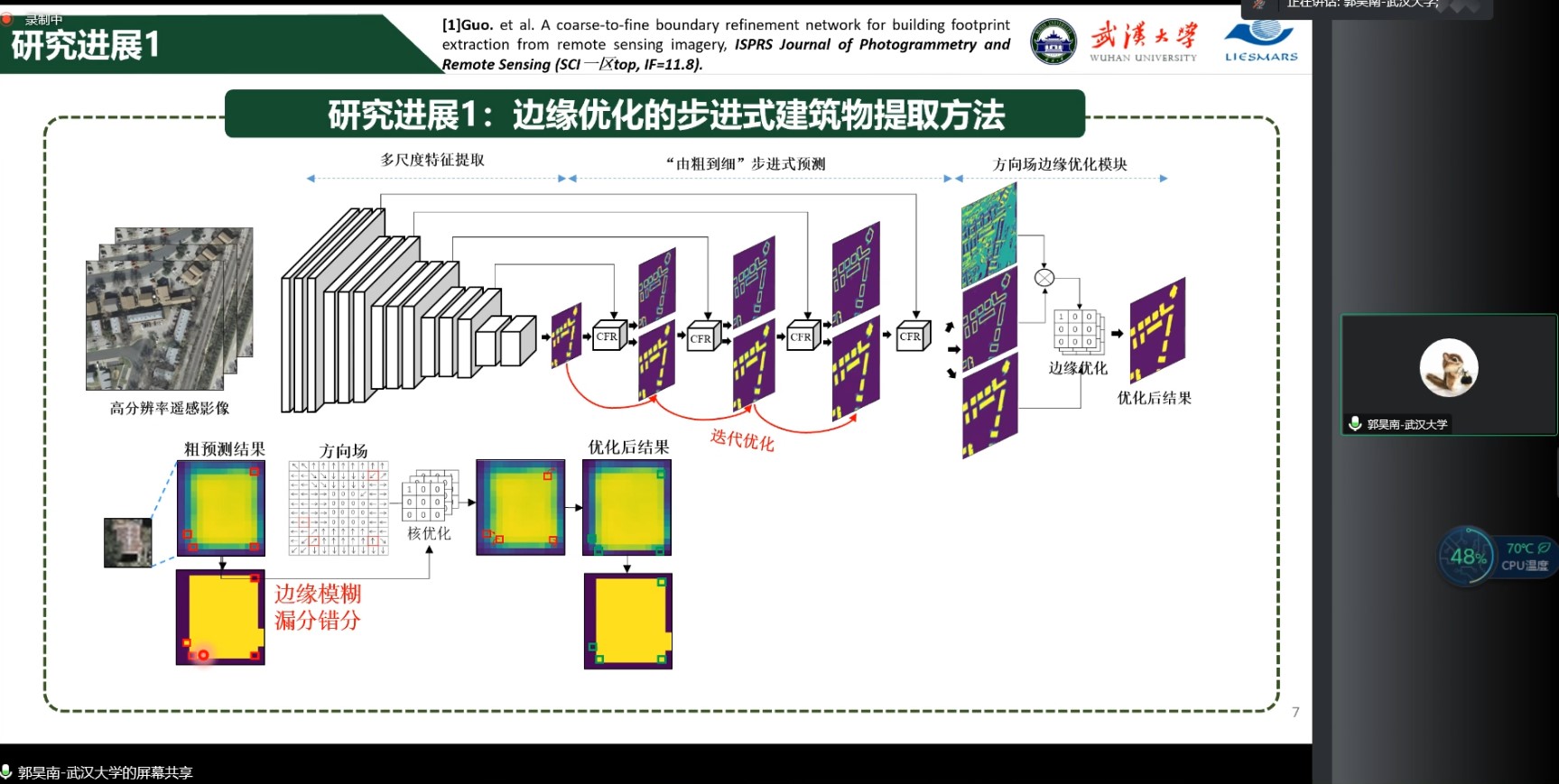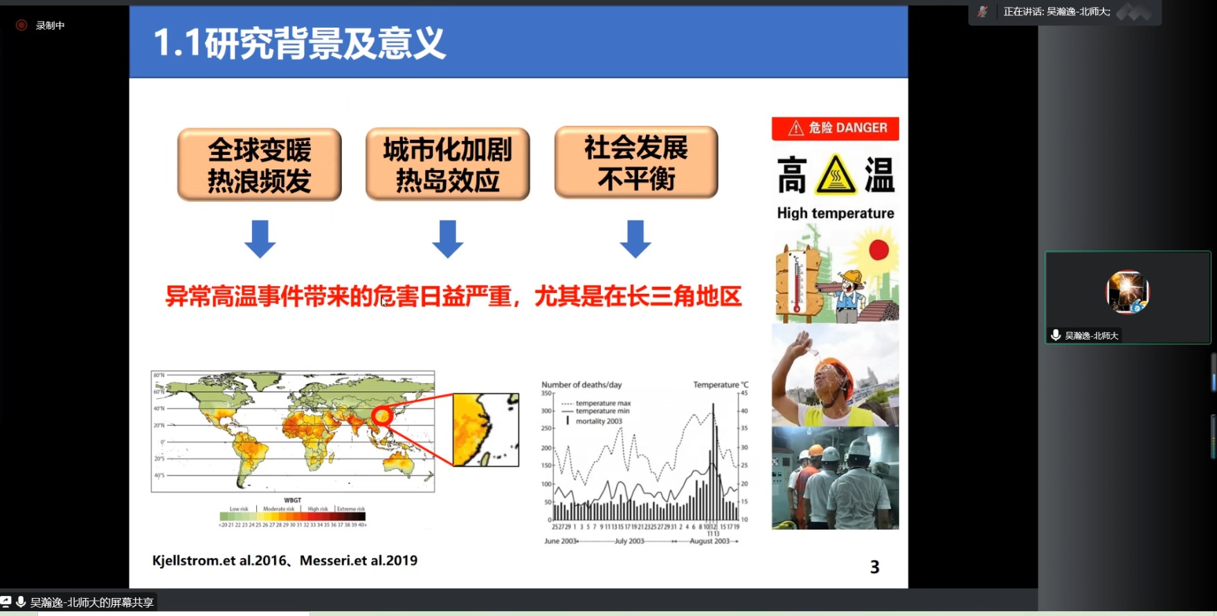 测绘遥感信息工程国家重点实验室的郭昊南同学针对复杂城市场景内建筑物存在语义差异的问题,提出了场景驱动的多任务建筑物提取网络框架;郑州大学地球科学与技术学院的李红丽同学,李同学首先对研究的背景及意义进行阐述,而后对FY-4A/AGRI传感器可见光-近红外波段的交叉定标流程及研究结果进行介绍;最后一位分享嘉宾为北京师范大学地理科学学部的吴瀚逸同学,吴同学构建了“危险-暴露-脆弱”高温风险综合评估框架,并进行高温风险主导因子分析,分析得到长三角地区高温风险具有显著空间差异性以及高温风险的主导模式。