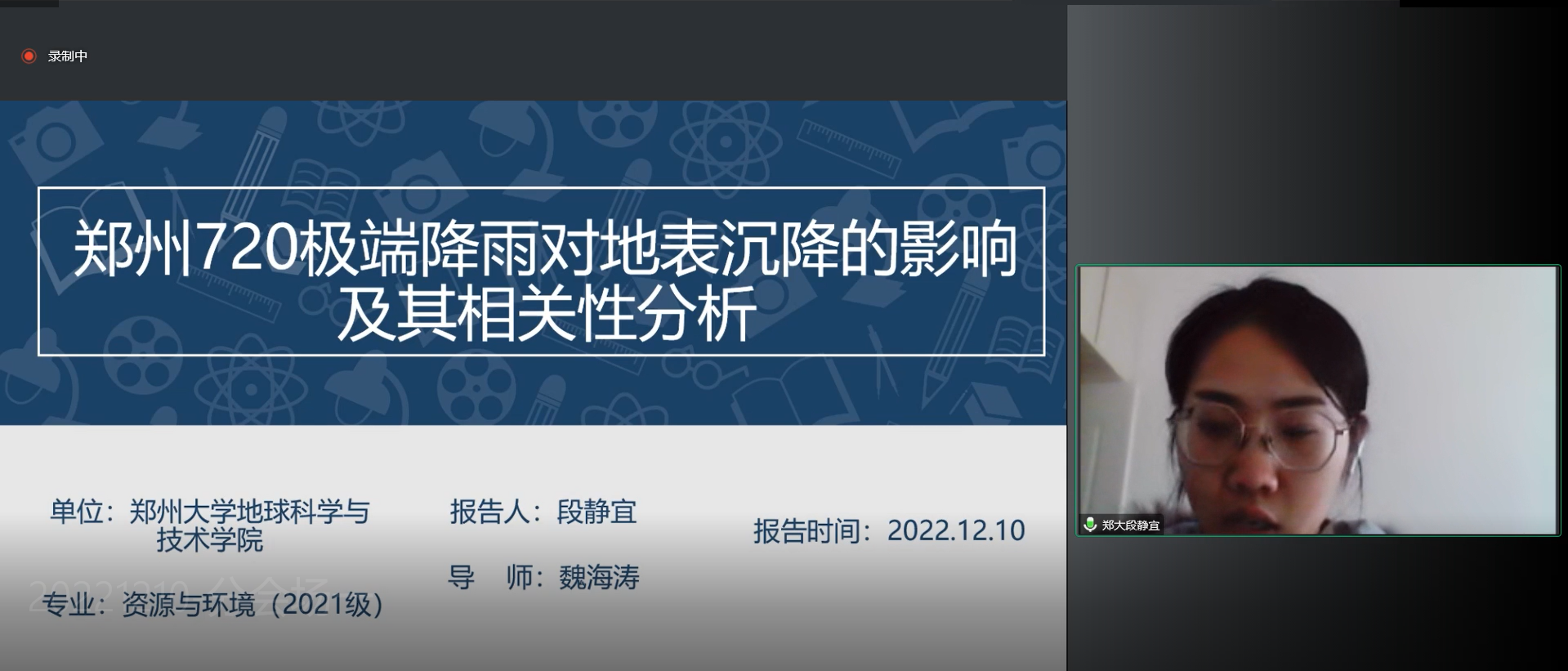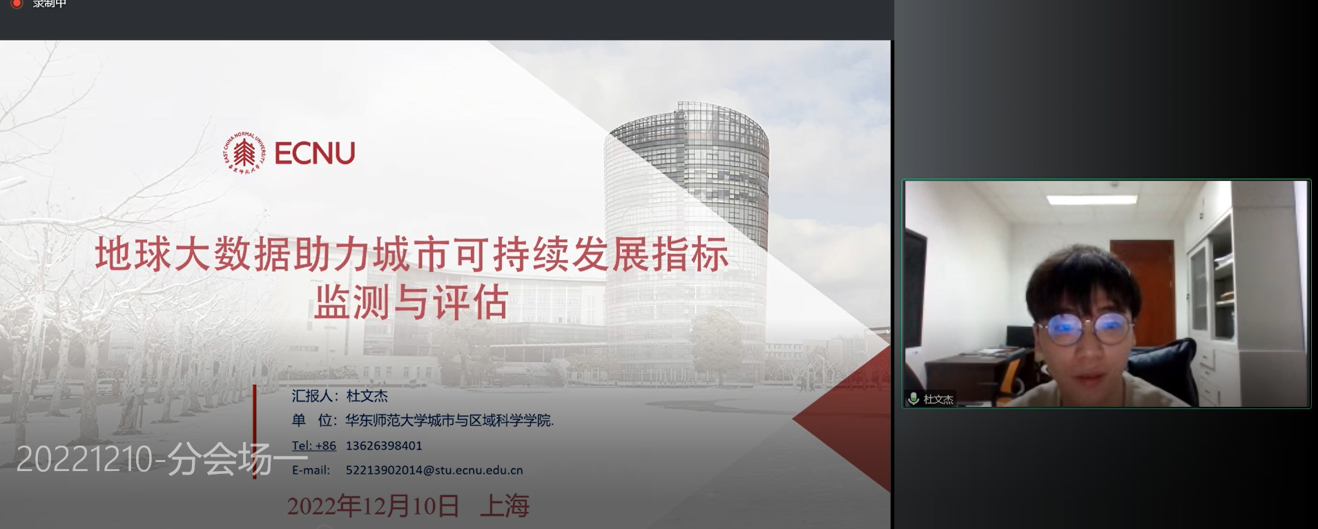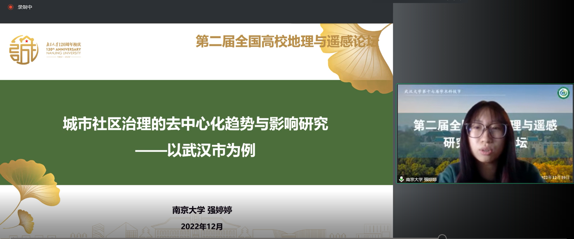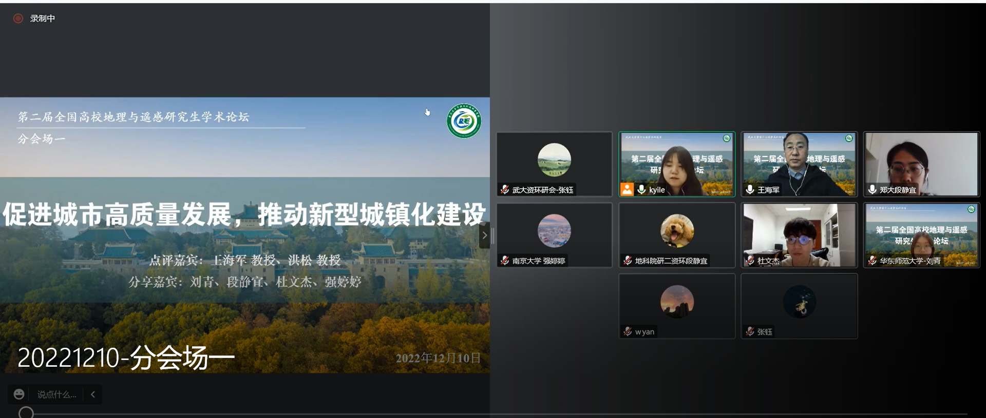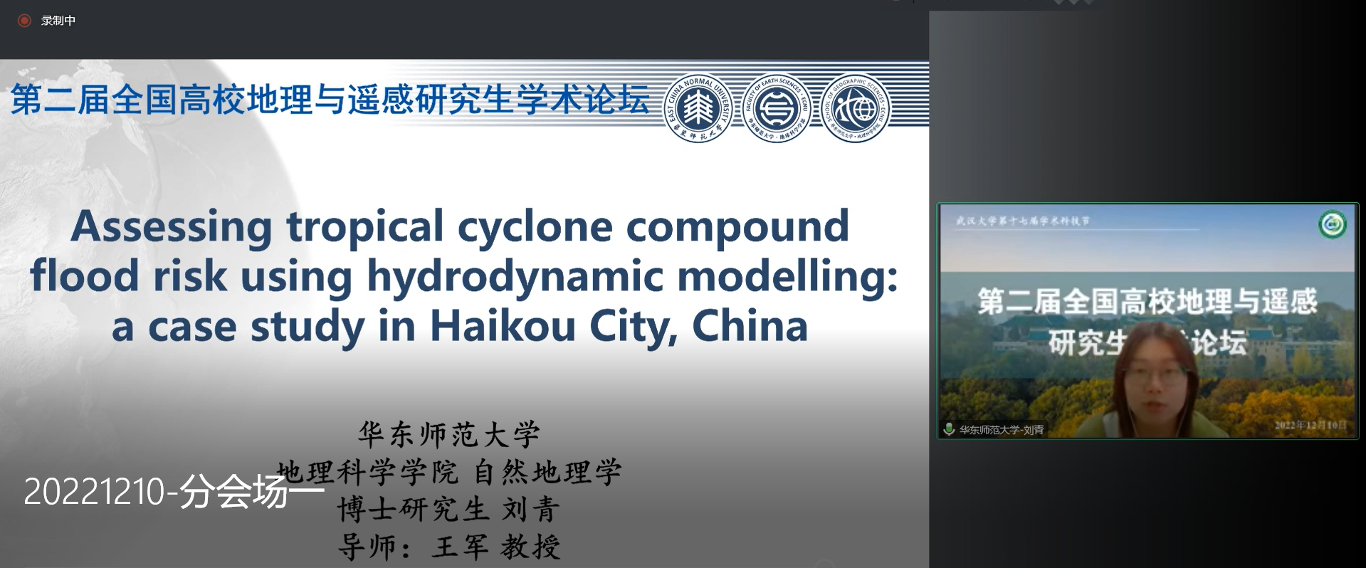 分会场四位嘉宾同学就自己的研究方向作了精彩报告。首先是来自郑州大学地球科学与技术学院的段静宜同学,她的报告探讨郑州市地面沉降的时空分布特征、720暴雨与郑州市地表沉降之间的关系,并验证了时序InSAR监测结果的有效性;来自华东师范大学城市与区域科学学院的杜文杰同学基于GEE平台生产了一套可用于监测SDG 11的不透水面时序产品,并结合地球观测和人口普查数据,使用土地利用效率指标估算了中国433个城市25年来城市化的土地、人口和经济领域之间的关系;来自华东师范大学地理科学学院的刘青同学以中国海口市为例,利用流体力学模型评估热带气旋复合洪水风险,可以为预防沿海洪水的研究提供重要启示;最后一位是来自南京大学地理与海洋科学学院的强婷婷同学,她以武汉市为例,研究了城市社区治理去中心化的演进过程、路径及影响,揭示了我国城市社区治理去中心化的演进过程,提出了社区治理去中心化的两条实现路径,并基于“武汉城市留言板”数据检验去中心化给社区治理带来的影响。