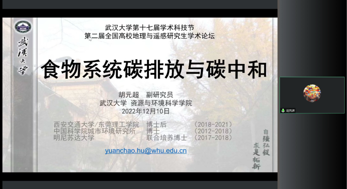 胡元超老师的报告主题为“食物系统碳排放与碳中和”,报告从食物系统的生产、加工、运输、消费等环节为我们介绍了碳排放核算、减排潜力模拟、新型减排路径探讨等方面的研究,并以自己团队的研究进展入手为我们讲述了食物系统碳排放模拟研究的前沿问题及未来研究方向,提出了碳减排的措施和建议:如食物替代、提高农村地区的饮食质量、减少消费环节的食物浪费等,这些途径能在一定程度上帮助我们实现健康和环境保护的协同效益。