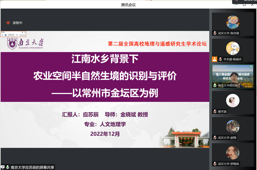 分会场同学围绕三农问题进行主题汇报。南京大学地理与海洋科学学院的殷齐琪同学围绕土地综合政治推动乡村重构与转型进行汇报,描述了土地综合政治驱动乡村空间、经济和社会重构的三个关键机制;南京大学地理与海洋科学学院的应苏辰同学以常州市金坛区为例分析江南水乡背景下农业空间半自然生境的识别与评价研究,建立一种农业空间半自然生境可行的识别及评价方法体系;老王论坛