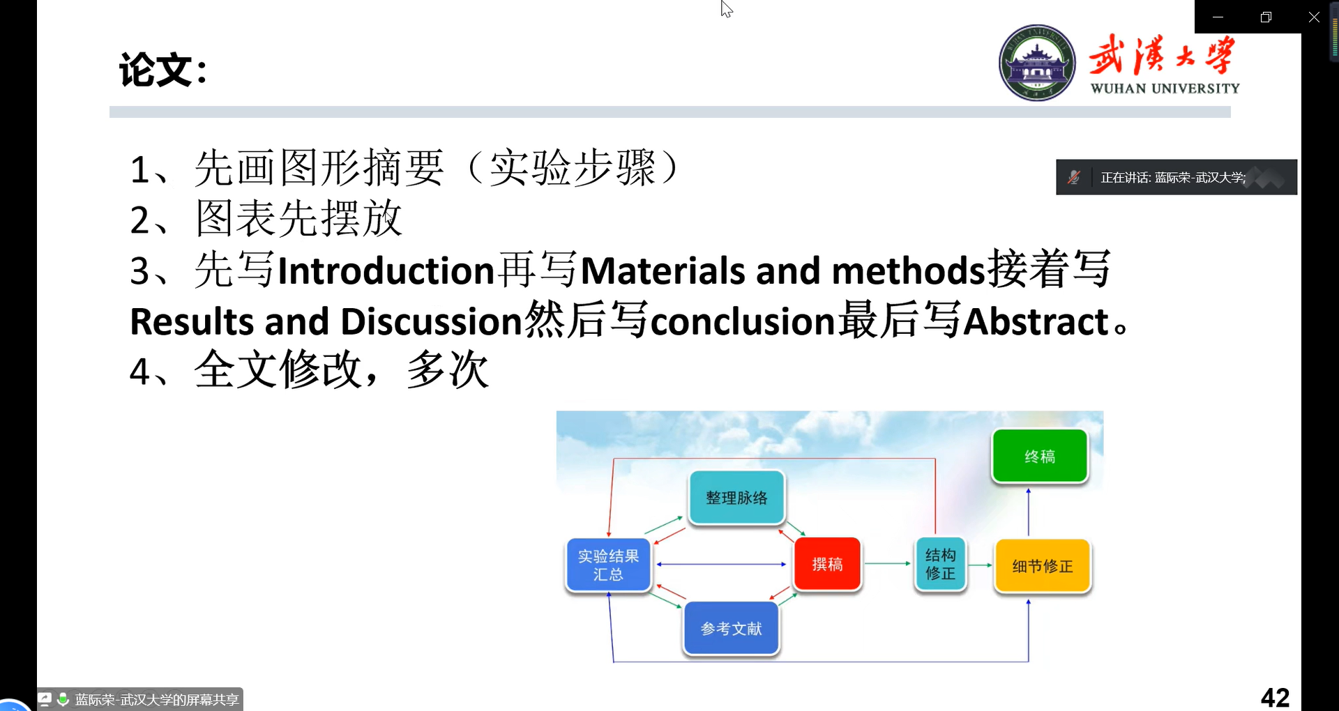 第四部分是“成果与投稿”。在论文写作的过程中,蓝师兄建议先画图形摘要和摆放图表,这样有利于形成论文的骨架,然后再写文字进行添砖加瓦。对于论文的Introduction部分,主要包括研究范围、研究背景、提出自己的研究点、研究策略方法及研究结论,内容上要简洁明了、逻辑性强、层层递进。对于投稿要关注论文与期刊的相符度以及论文的创新性。写论文最重要的一点是具备完整性和逻辑性。