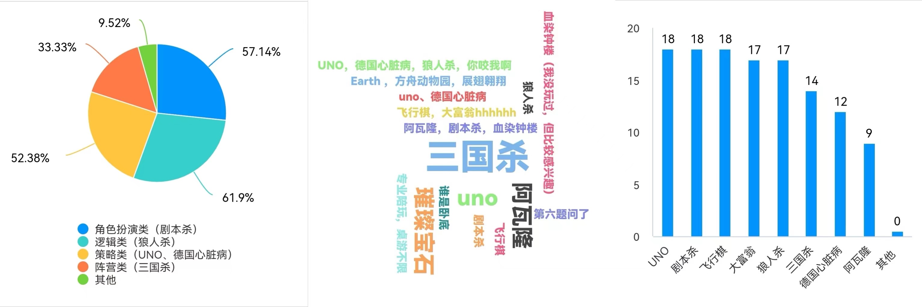 桌上游戏发源于德国,在欧美地区已经风行了几十年。桌上游戏内容涉及战争、贸易、文化、艺术、城市建设、历史等多个方面,大多使用纸质材料加上精美的模型辅助。作为一种面对面的游戏,其非常强调交流。游戏的过程多是注重思考如何利用有限的资源达成既定目标,直接地锻炼了参与者多方面的思考能力,而且以游戏的方式表达,过程生动有趣,能锻炼思考能力的同时又不失吸引力。本次活动广泛征集了同学的建议,通过问卷的方式调查同学们的喜好,并根据统计数据挑选桌游供同学们选择游玩。统计后初步为同学们提供了三国杀,大富翁,狼人杀,阿瓦隆,UNO和德国心脏病共六种桌游。