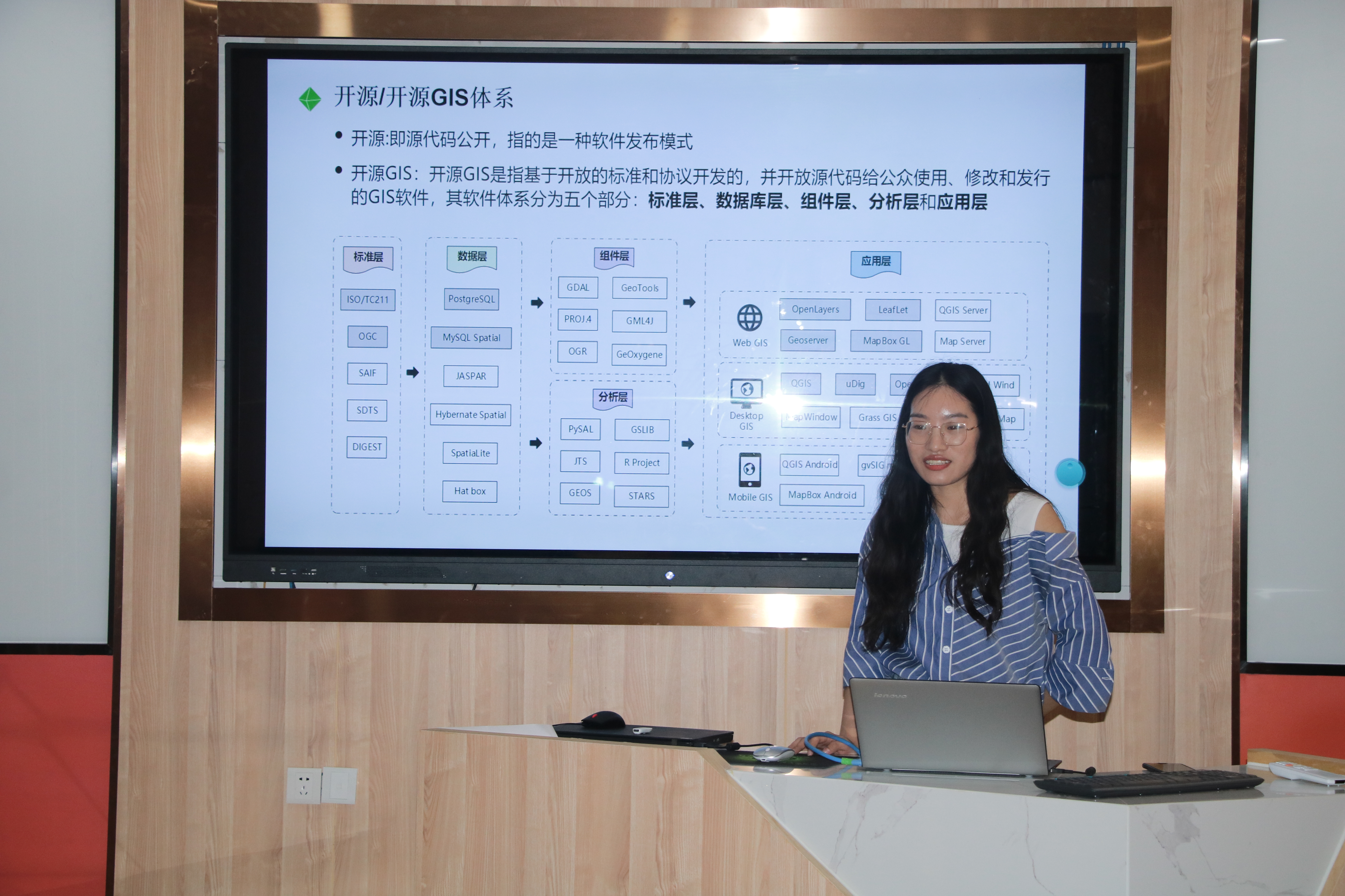 讲座伊始,刘越同学从开源GIS体系、QGIS的起源与发展、QGIS的功能体系三个板块内容进行了详细地介绍。刘越同学指出开源GIS是指基于开放的标准和协议开发的,并开放源代码给公众使用、修改和发行的GIS软件,其软件体系可以分为标准层、数据库层、组件层、分析层和应用层五个部分。QGIS包含多格式数据加载与导出、数据编辑处理、数据空间分析、可视化制图、地图发布以及可扩展的插件构架系统在内的6大核心功能,是一款功能强大的轻量级开源GIS软件。