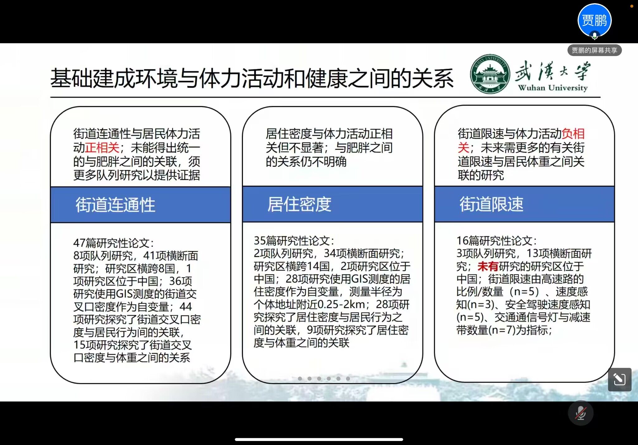 接着,贾鹏老师针对地理信息与公共卫生领域的交叉学科研究方法和创新方式进行了详细的介绍。首先介绍了空间全生命周期流行病学的概念,及其与多学科的融合关系,即利用地理信息系统和空间分析技术,描述与分析人群疾病、健康和卫生事件的空间分布特点及发展变化规律,探索影响特定人群健康状况的决定因素,并为防治疾病、促进健康以及卫生服务提供了策略和措施上的建议。随后他以自己的研究为例,讲解了街道联通性与居民体力活动的关联性、街道限速与体力活动的相关性、基于真实世界患者就医行为重新界定分级诊疗区域边界等内容。