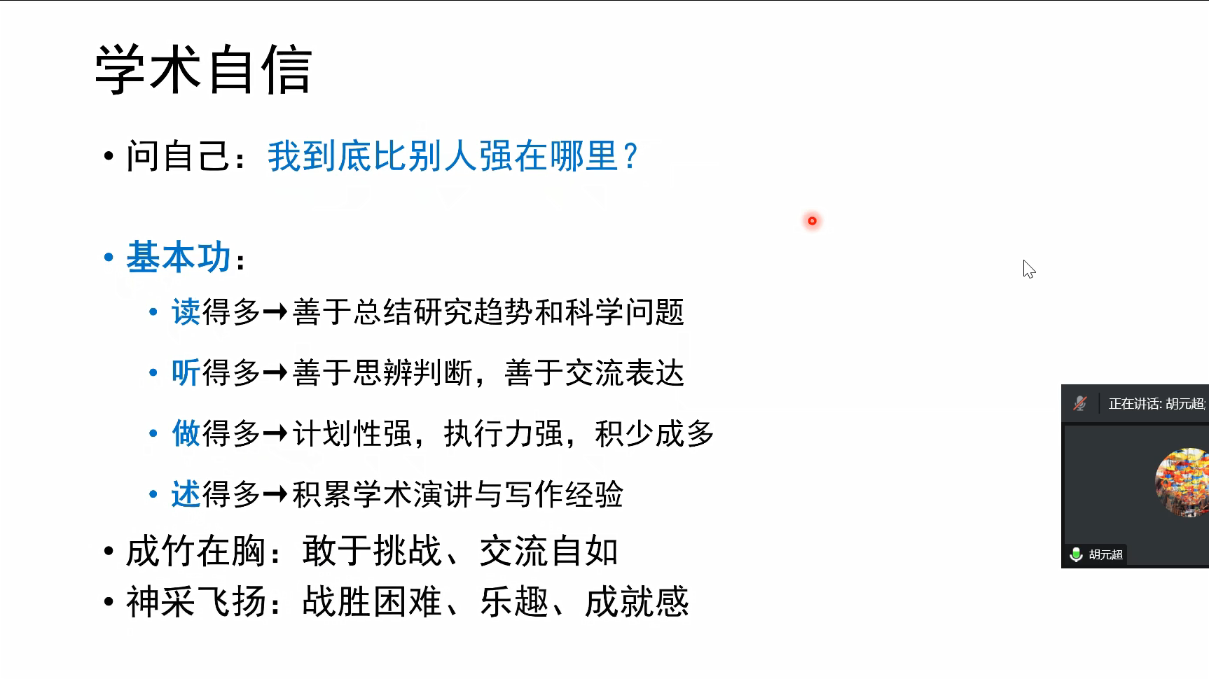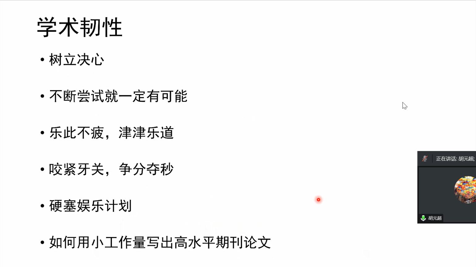 最后一个层面是“器”,即学术韧性。在研究生期间我们可能会遇到包括数据、实验、论文写作在内的各种各样的困难,所以我们要有战胜一切困难的心力,树立决心,相信不断尝试就一定有可能,克服困难做到游刃有余的理想状态。另外很重要的一点是学会享受自己的工作状态,乐此不疲且津津乐道。最后胡元超老师还特别指出无论科研工作再忙,也要制定一定的娱乐、锻炼计划帮助自己放松,劳逸结合,张弛有度。
