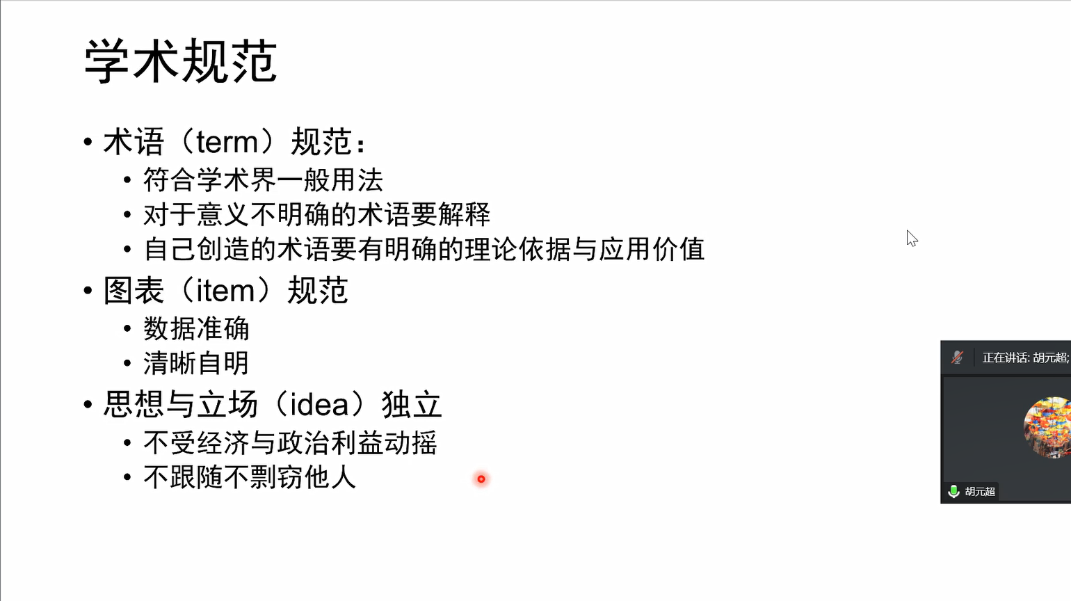 第三个层面是“法”,即学术规范。在这个层面,胡元超老师主要强调了术语规范、图表规范、思想与立场独立三个方面,是我们在研究生期间必须遵守这几点学术规范。同时学术规范的另一层含义是我们需要有一些最基本的认识和观念。胡元超老师分享了自己的认识与观念,即应当注重成果质量而非数量,并且理性看待行业内顶级期刊的文章并保持思考。