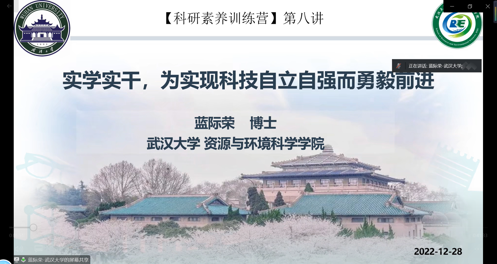 第八讲邀请了老王论坛 2020级优秀博士生蓝际荣为同学们分享了“实学实干,为实现科技自立自强而勇毅前进”。蓝师兄首先通过三组关键词:“热爱+勤奋”“合作+借力”和“坚持+换挡”分享了自身的科研的心得体会。接着从从领域前沿追踪、实验设计技巧、实验过程控制、数据整理与分析、科研成果总结五个方面与同学们分享了环境类科研论文写作的技巧和经验,为同学们的论文写作提供了宝贵经验。