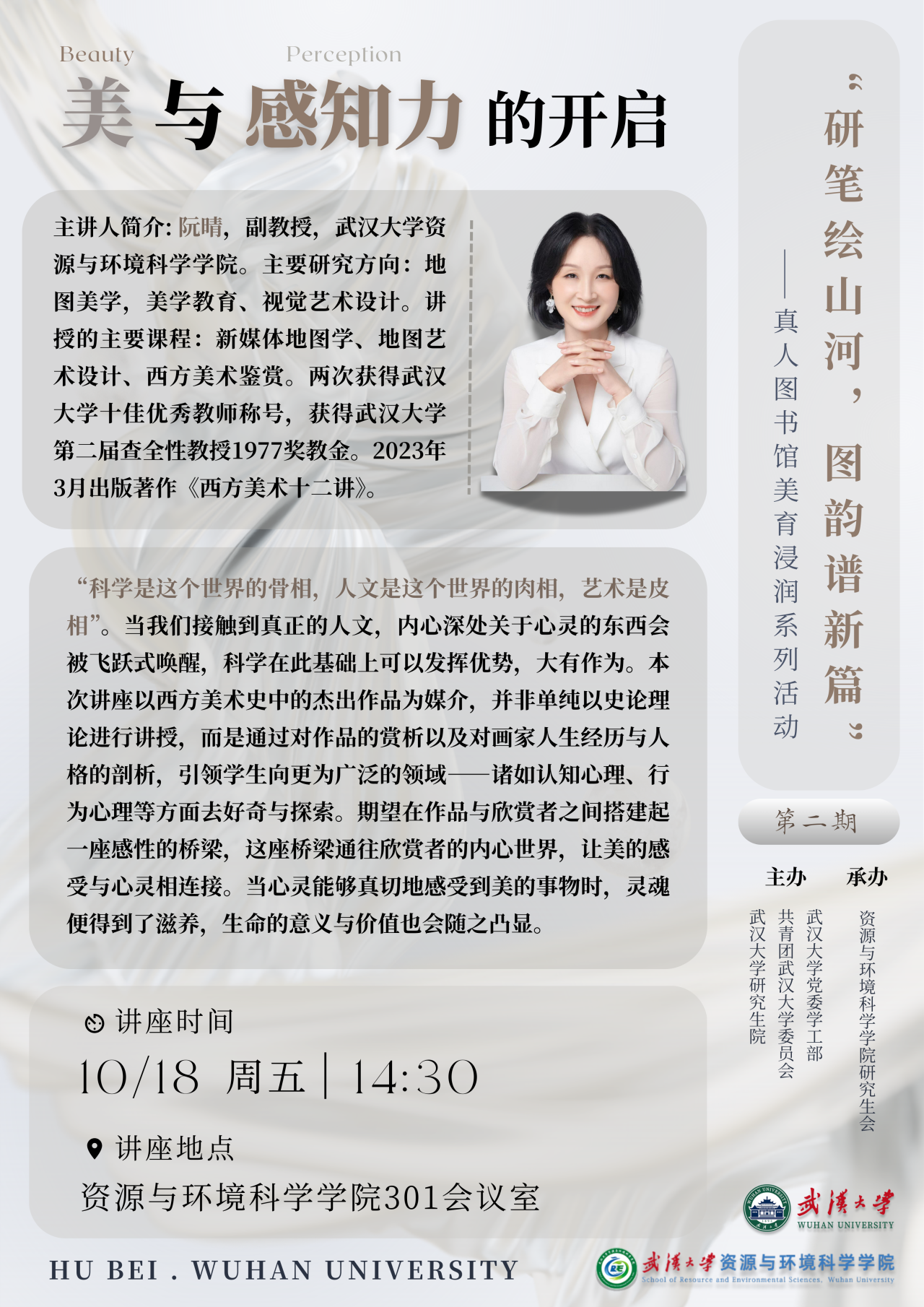 为全面提升学生的博雅审美感知力,提高学生的创新创造及实践能力,丰富学生的精神文化生活,资环研会主办的真人图书馆美育浸润系列活动开办啦!真人图书馆作为一种创新的活动形式,将每位嘉宾的知识、思想、情感都凝聚成一本独特的“真人图书”,打破了传统图书馆以书为书的限制。在活动中嘉宾们不仅分享自己的知识和经验,更将自己的艺术修养,审美情趣融入其中,让学生实现知识与审美的双重提升。