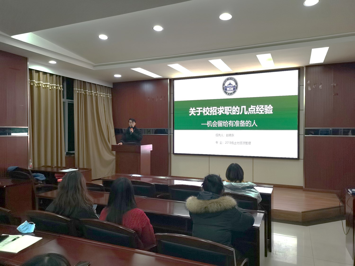 赵晓东通过求职中的关键要素,向同学们分享了地域、薪资、单位类型、加班强度等因素对于职业选择的影响。同时师兄也向同学们分享了秋招季中打好求职信息战的方法。在提问环节,师兄向同学们介绍了武汉市内较为大型的国企事业单位的招聘情况及其薪资待遇水平。