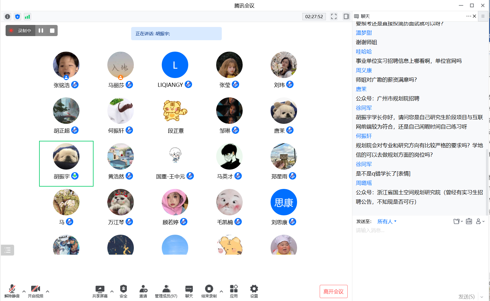 分享环节结束,互动问答环节同样精彩。百余人参与的线上会议,聊天窗口有条不紊,气氛火热,同学们的问题丰富多样,师兄师姐们的回答具体详实,分享会就在这样轻松愉悦的氛围中,圆满结束了。