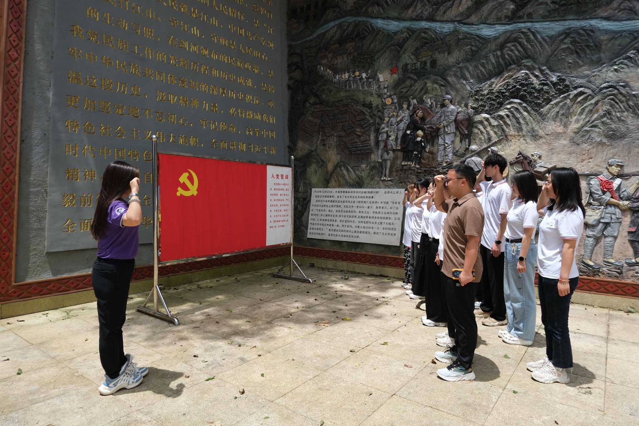 随后,实践调研团队成员跟随舒俊蛟校友前往剑河县镇江村参观“毛主席送毛衣”故地,开展红色历史学习。在红色基地,梅菲老师带领团队成员重温了入党誓词,从红色历史中汲取了精神力量。