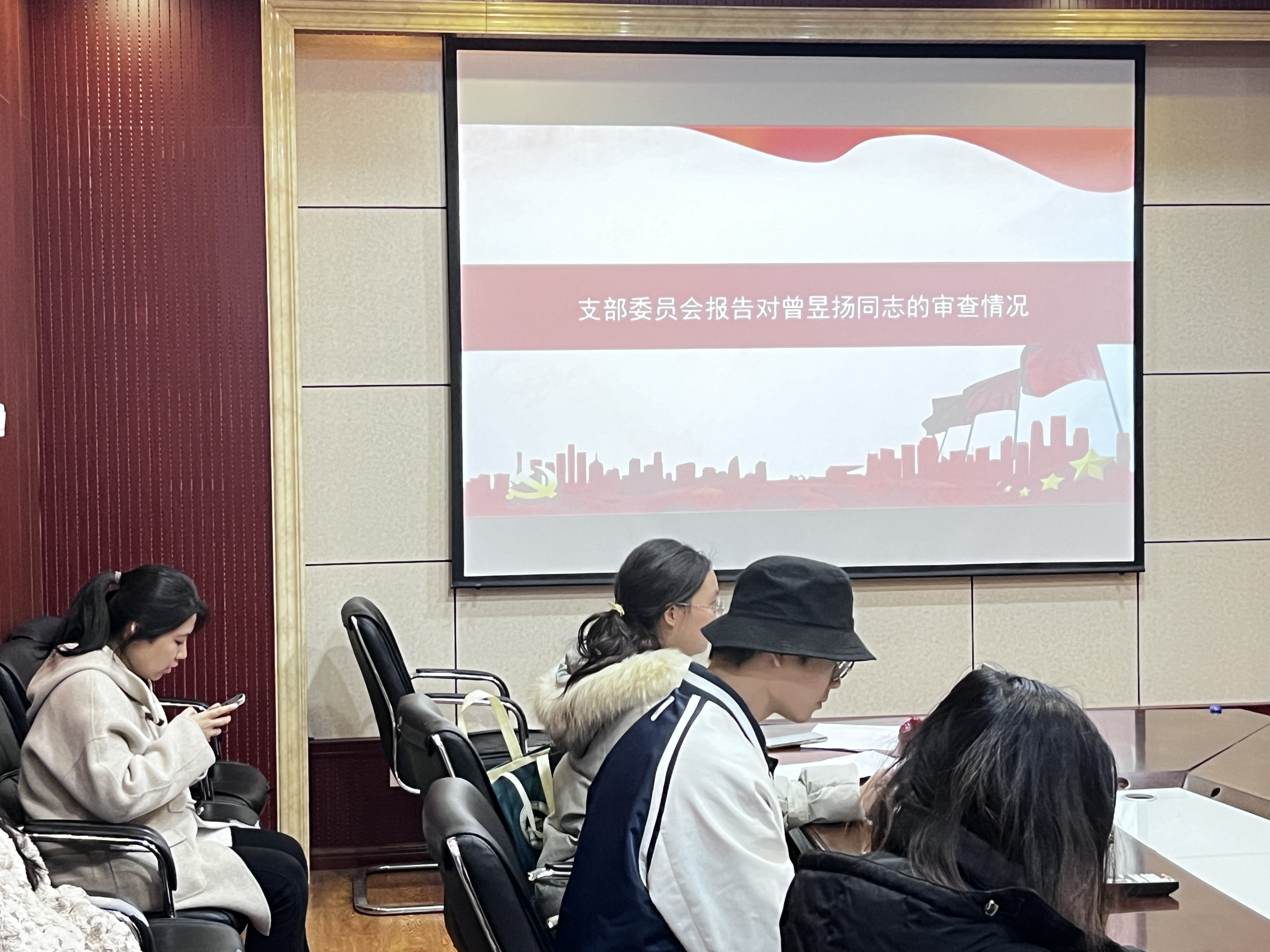 会议第二项,讨论接收曾昱扬同志为中共预备党员。首先,由曾昱扬同志就自身情况、入党动机、思想状况、学习情况等向党组织进行了汇报。接下来,由入党介绍人依次介绍有关情况:曾昱扬同志在政治思想学习和个人修养提升方面积极向党组织靠拢,符合党员标准。张玥同志代表支委会报告审查情况:曾昱扬同志发展流程规范,政审合格,符合入党条件。