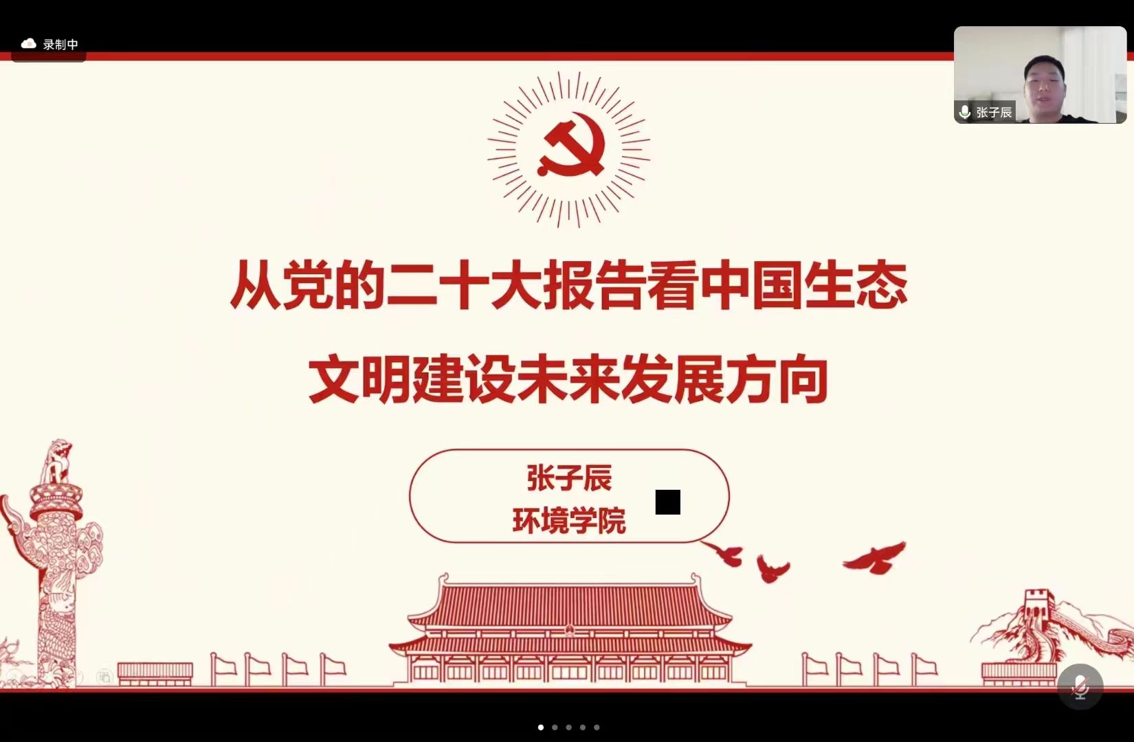 环境科学与工程系研究生第四党支部于2023年11月27日晚上7点30分以腾讯会议形式召开学习分享会暨支部组织生活会。本次会议由支部书记邓萌杰同志主持,特别邀请到清华大学环境学院博士生讲师团的张子辰同学为支部成员讲课。宣讲内容为:从党的二十大报告看我国未来生态文明建设未来发展方向。会议应到正式党员24人,实到正式党员21人,可以开会。