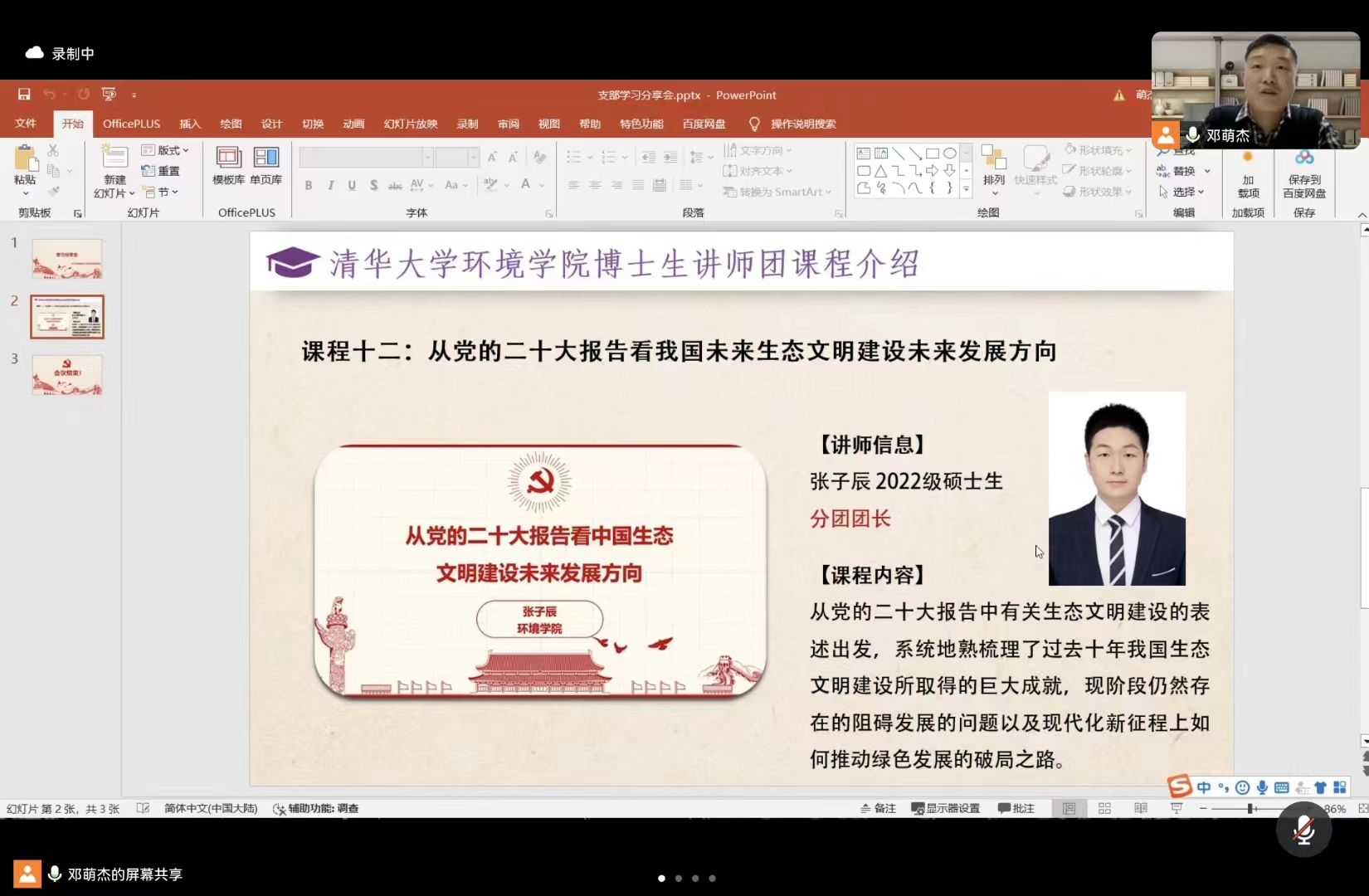 会议第一项:支部书记邓萌杰同志向支部党员同志介绍清华大学环境学院博士生讲师团的张子辰同学,并热烈欢迎张子辰同学为党支部讲授党的二十大规划的生态文明建设未来发展方向。
