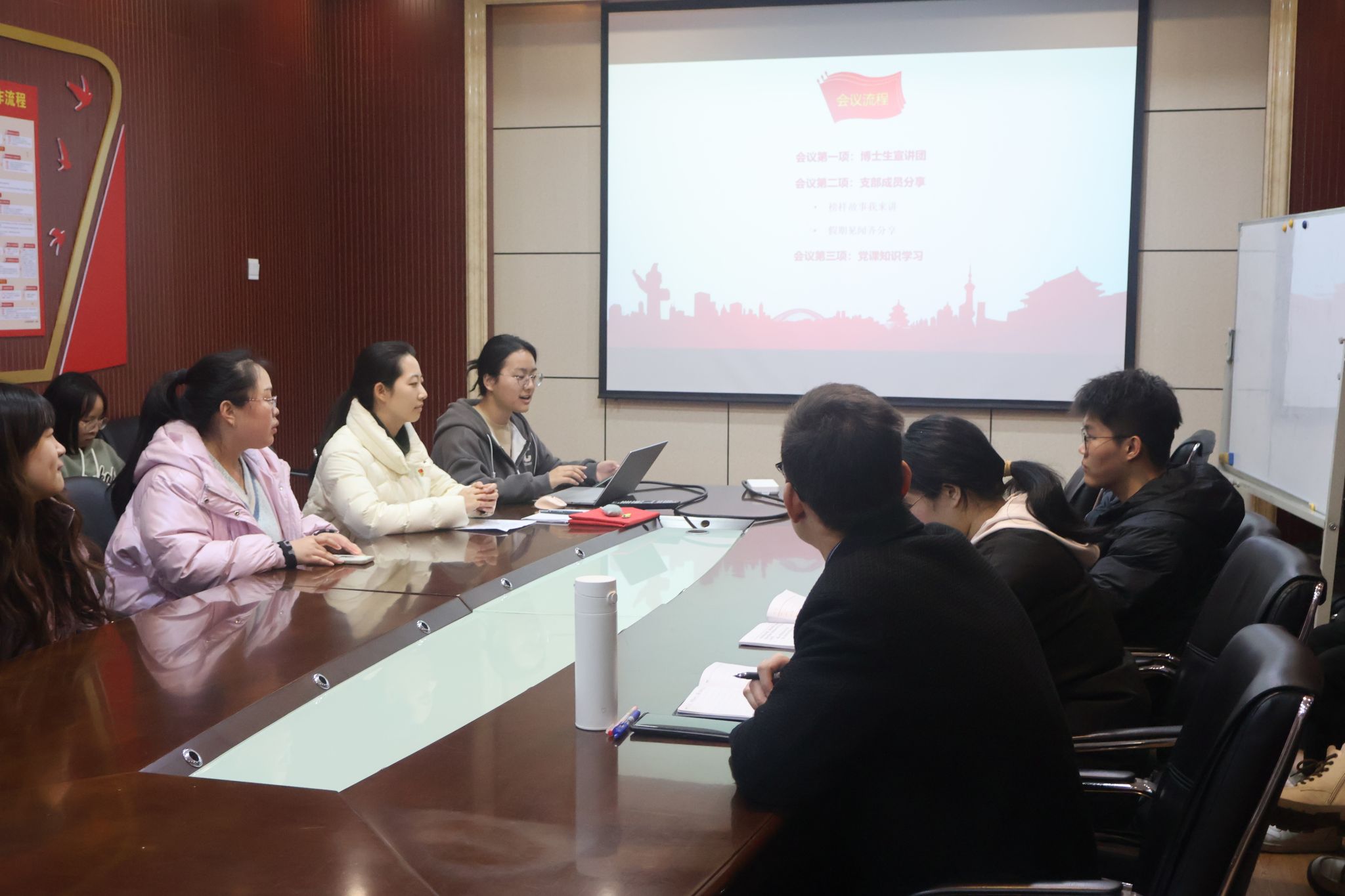 2024318日晚7:00,地理科学与国土资源系研究生第三党支部于院办504召开“技能成才,强国有我”主题党日活动。本次会议由支部书记马淼同志主持。会议主要分为三个部分,第一是由博士生宣讲团成员陈乾奕,以“教育强国路上的珞珈人”为主题开展讲座,第二由支部成员就假期见闻和榜样故事进行分享和交流,第三是由党支书主持进行党课知识学习。