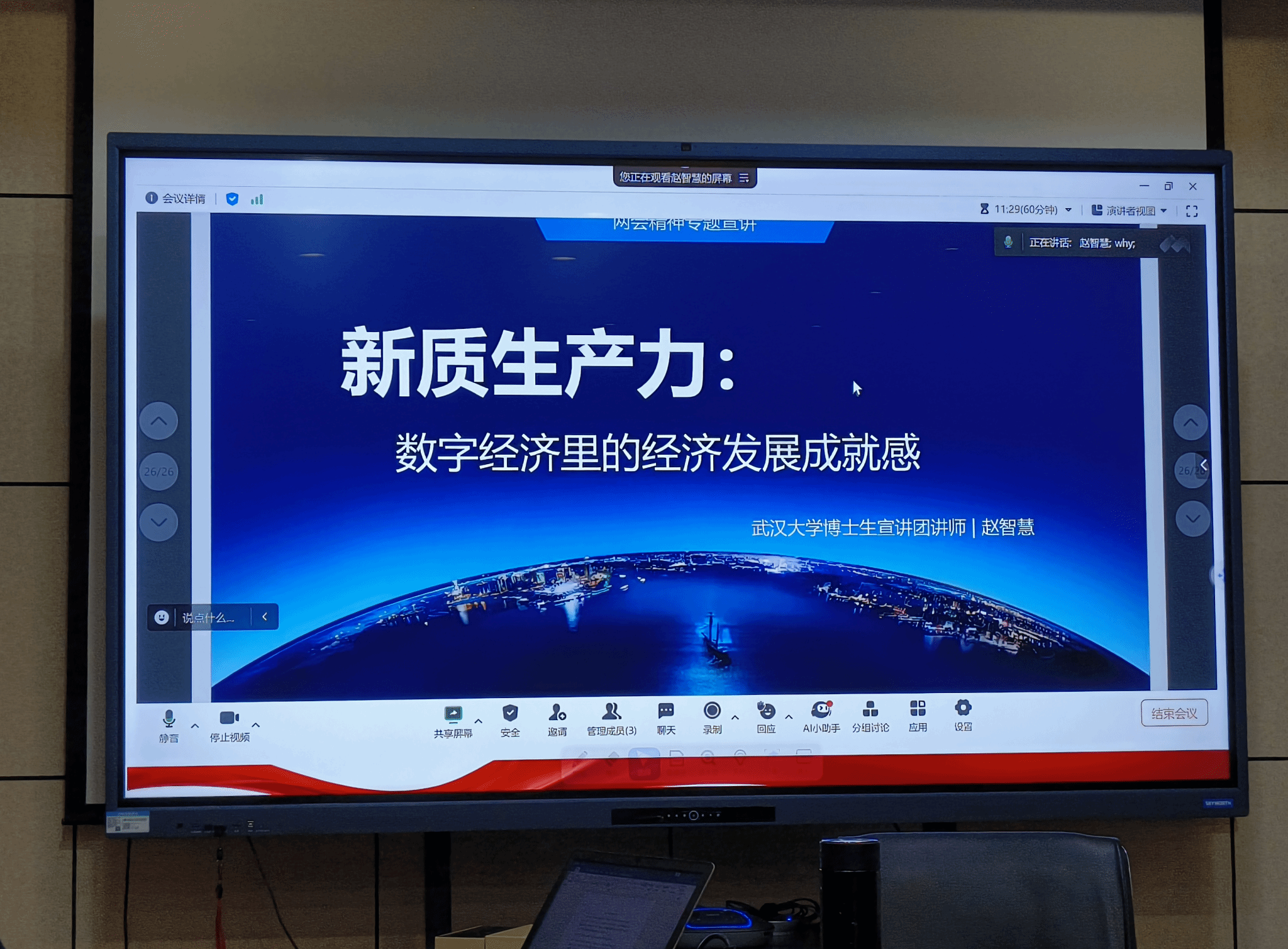 接着,博士生宣讲团讲师赵智慧同志开展“新质生产力:数字经济里的经济发展成就感”的主题宣讲,分享了新质生产力是什么、新质生产力的特征以及内涵,鼓励与会党员积极参与到数字贸易和新质生产力的建设中来,不断提高自身的素质和能力,为实现中华民族伟大复兴贡献自己的力量。