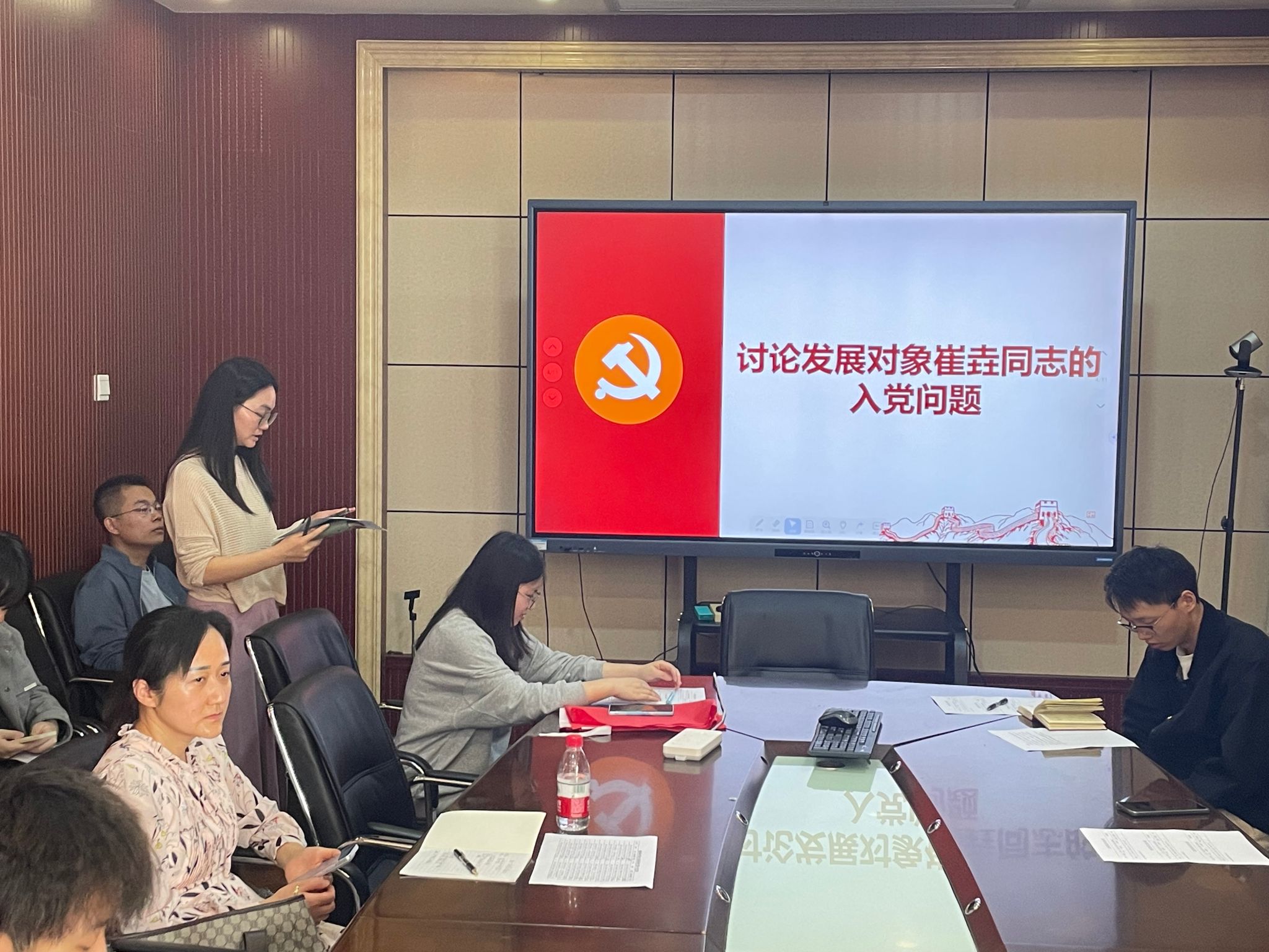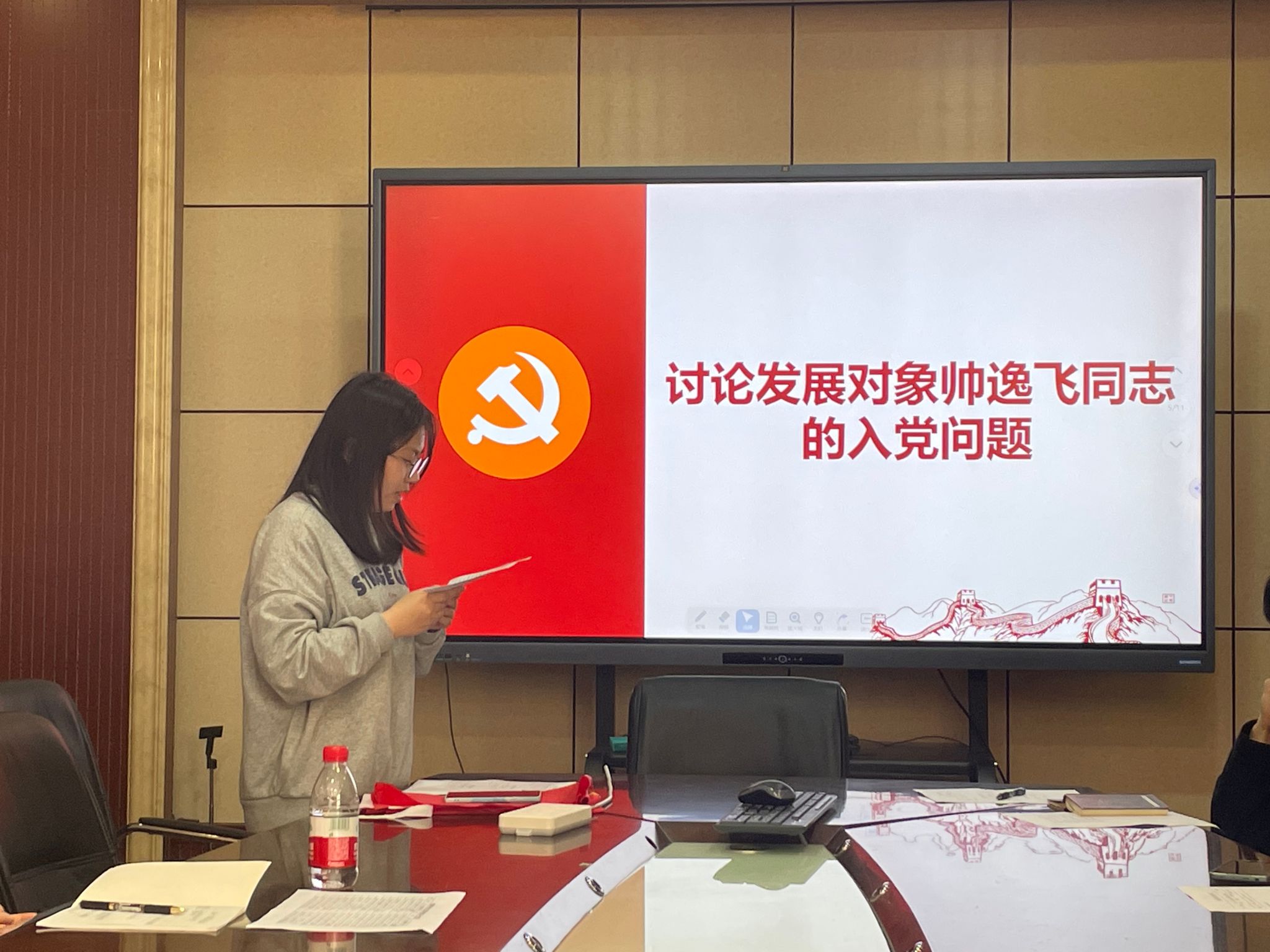 会议第一项,预备党员接收大会,讨论发展对象黄赫、崔垚、帅逸飞同志的入党问题。首先,三位发展对象同志详细汇报自身对党的认识、入党动机、本人履历,表达自己入党的决心。入党介绍人分别对发展对象的培养考察情况作了详细介绍,均表示同意吸收他们成为预备党员。支部书记胡艺川同志向支部大会报告各位发展对象综合政治审查情况,最后与会党员进行充分讨论,均对三位同志的表现给予了肯定。