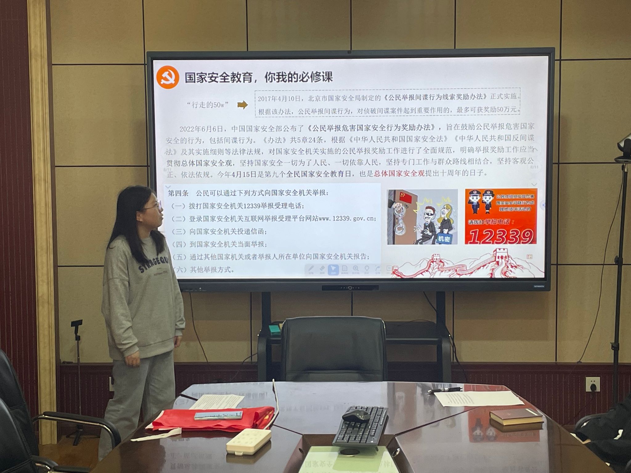 会议第二项,“国家安全教育”主题党会,由支部书记胡艺川同志领学。党支部书记胡艺川同志介绍了全民国家安全教育日的由来,强调了总体国家安全观的内涵和主旨,通过介绍总体国家安全观的核心要义,即“五大要素”、“五个统筹”和“十个坚持”,教育与会党员要牢记使命,时刻紧绷保护国家安全的弦不放松。介绍完毕后,由胡艺川同志带领大家观看了典型危害国家安全案例的系列教育警示视频,增进大家对总体国家安全观的认识。