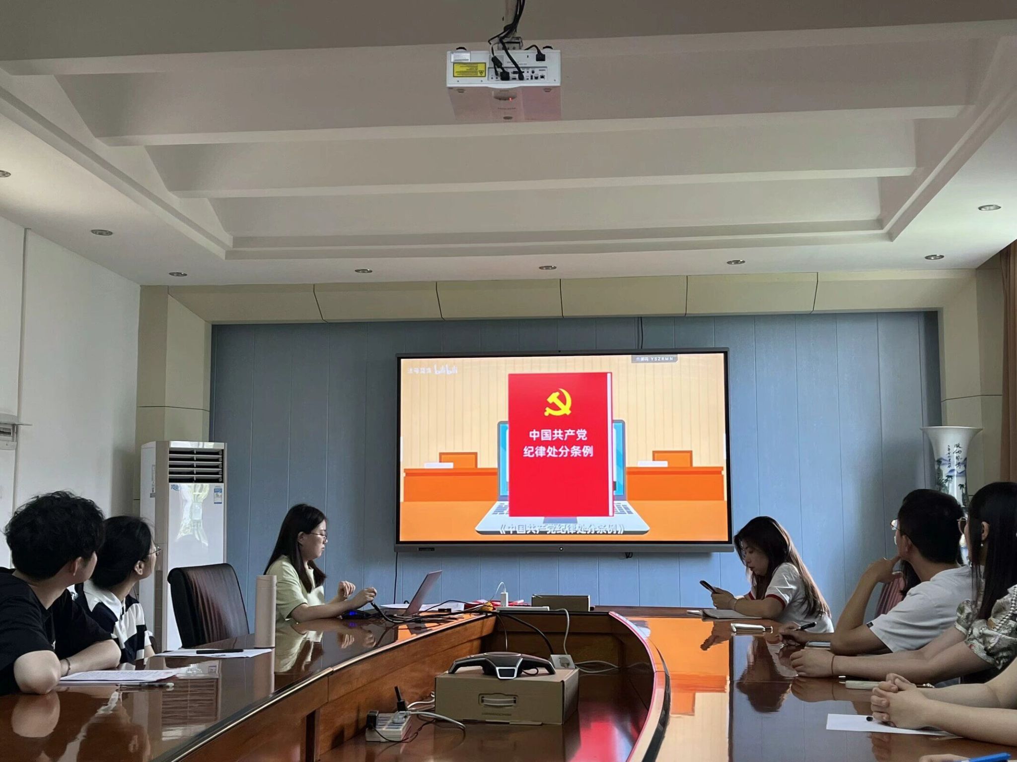 会议第二项,党纪学习教育,由支部书记胡艺川同志领学。支部书记胡艺川同志带领与会党员同志集中学习了《中国共产党纪律处分条例》的相关内容,从政治纪律、组织纪律、廉洁纪律、群众纪律、工作纪律和生活纪律六个方面详细介绍了党的纪律,并进一步展示了我国“坚持党要管党、全面从严治党”“党纪面前一律平等”“实事求是”“民主集中制”等要求和政策。