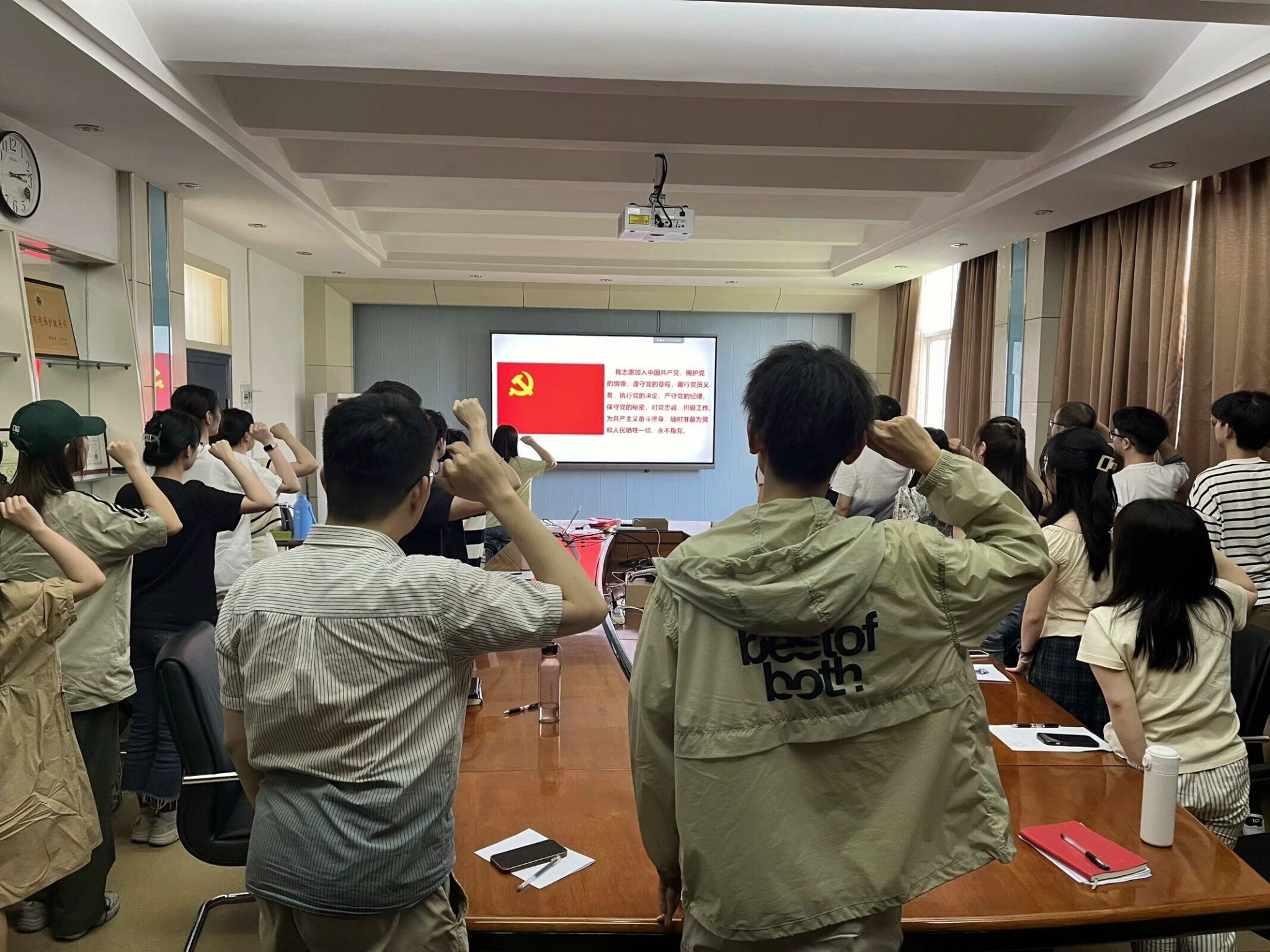 会议第一项,预备党员转正大会,讨论预备党员朱丹丹、王梓蒙同志的转正问题。首先,朱丹丹、王梓蒙同志先后向大会详细汇报自身在预备期内的思想学习、工作情况,再分别由入党介绍人对其培养考察情况作了详细介绍,支委卢婉婷同志代表支委会报告两位同志在预备期的教育考察情况,表示同意两位同志按期转正。经培养考察人和与会党员发表意见后,由正式党员进行无记名投票。现场公示投票结果,朱丹丹、王梓蒙同志票型一致,均为同意17票,反对0票,弃权0票。经表决,朱丹丹、王梓蒙同志得到党支部大会的一致认可。胡艺川同志宣布支部决议,同意朱丹丹、王梓蒙同志的转正申请,并带领各位党员进行入党誓词宣誓。