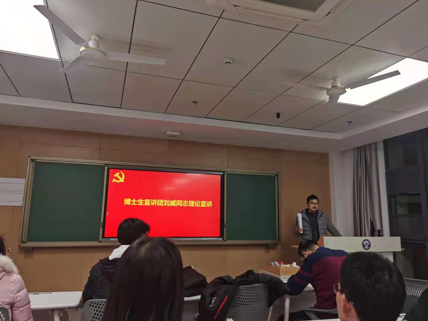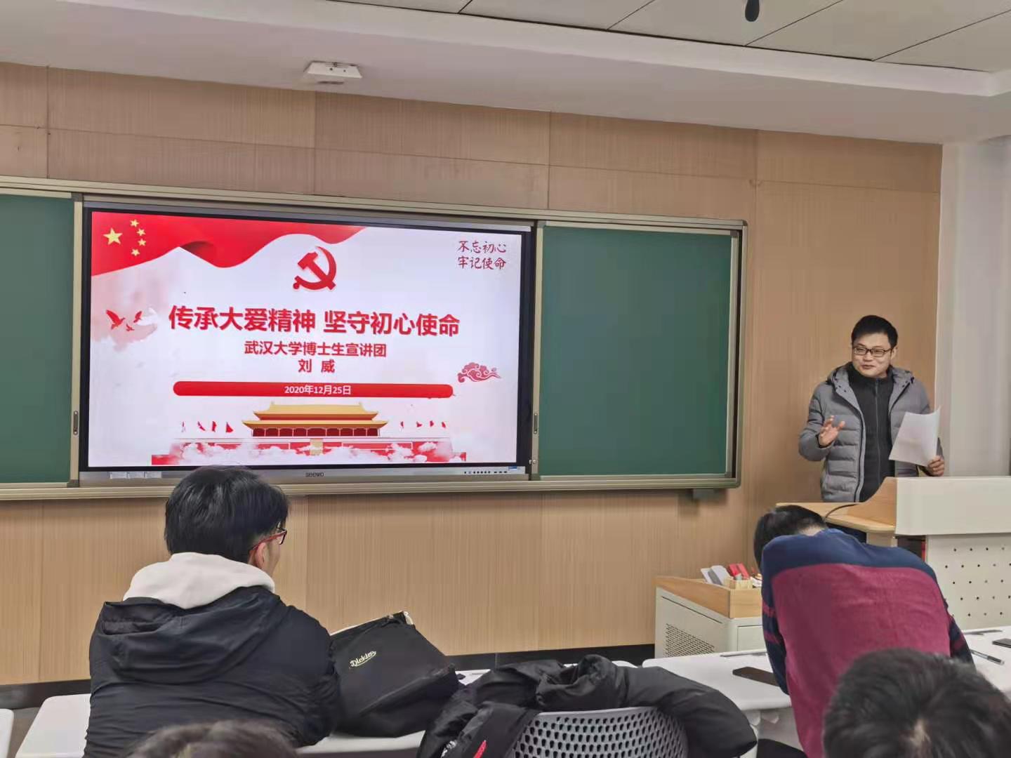 博士生宣讲团副团长刘威同志带来“传承大爱精神,坚守初心使命”的主题宣讲;四,全体到场人员集体讨论并作总结报告。